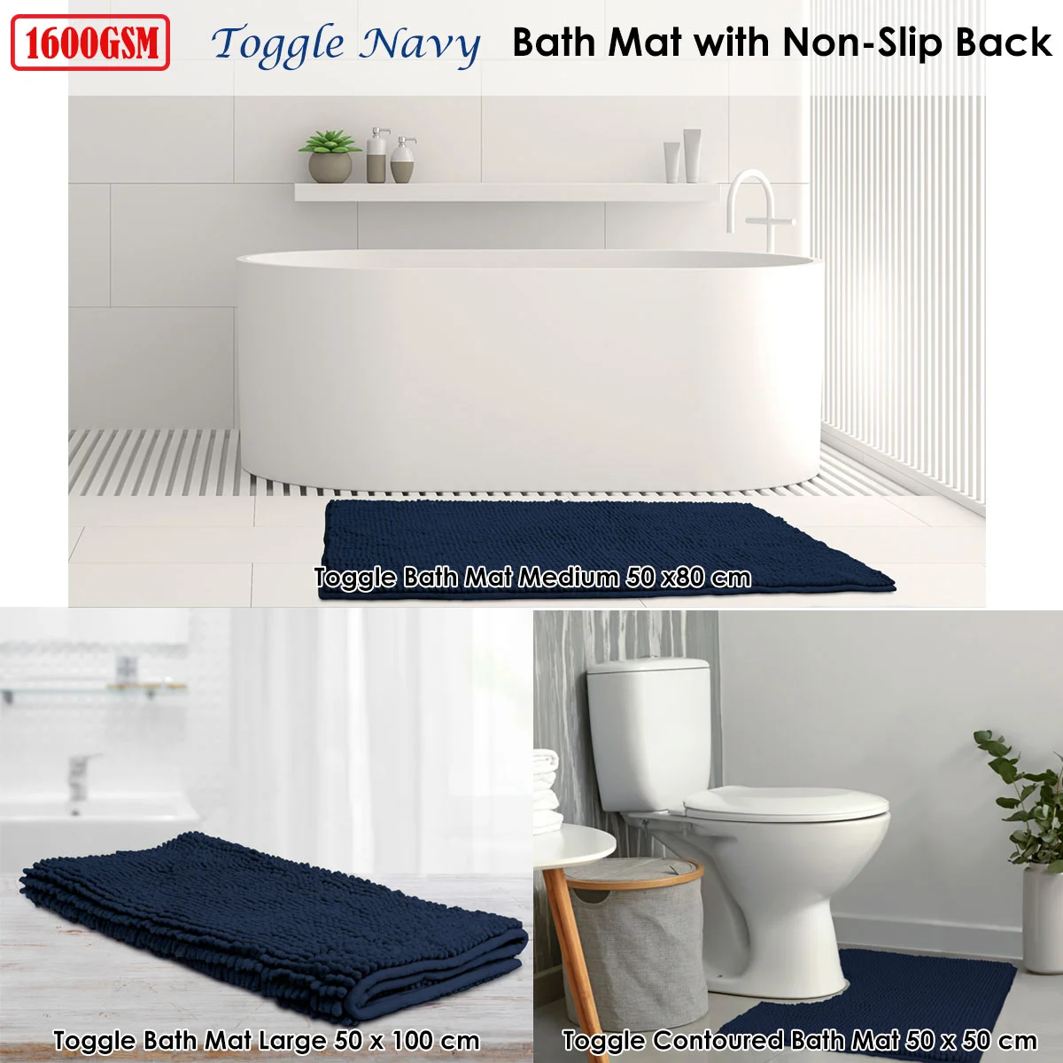 This luxurious 1600GSM Toggle Microfiber Bath Mat with Non-Slip Back Navy is fast drying, absorbent and features non-slip backing. It comes with a lovely applique design in soft colour tone that will refresh your bathroom style. It is made from high quality microfiber fabric with easy care properties.