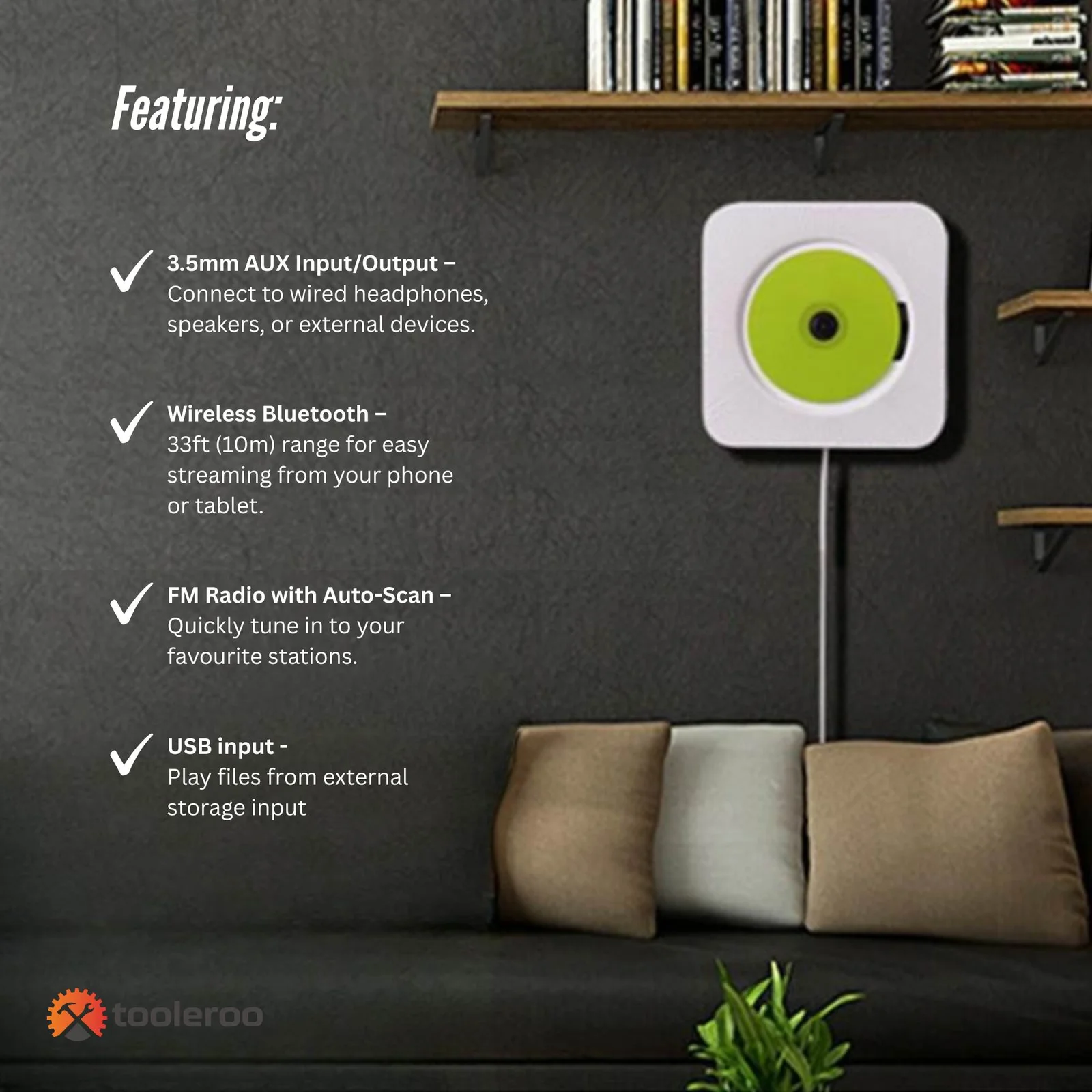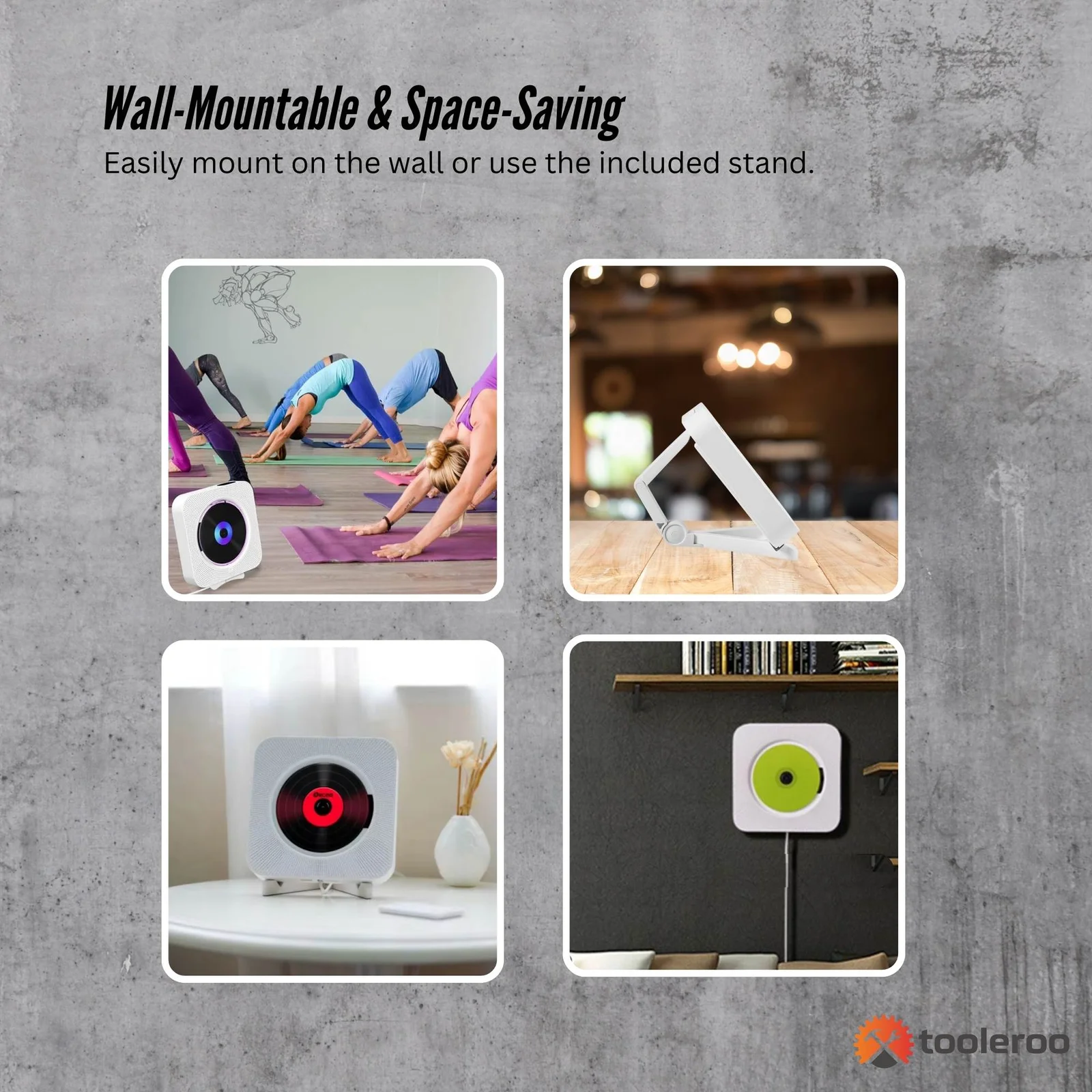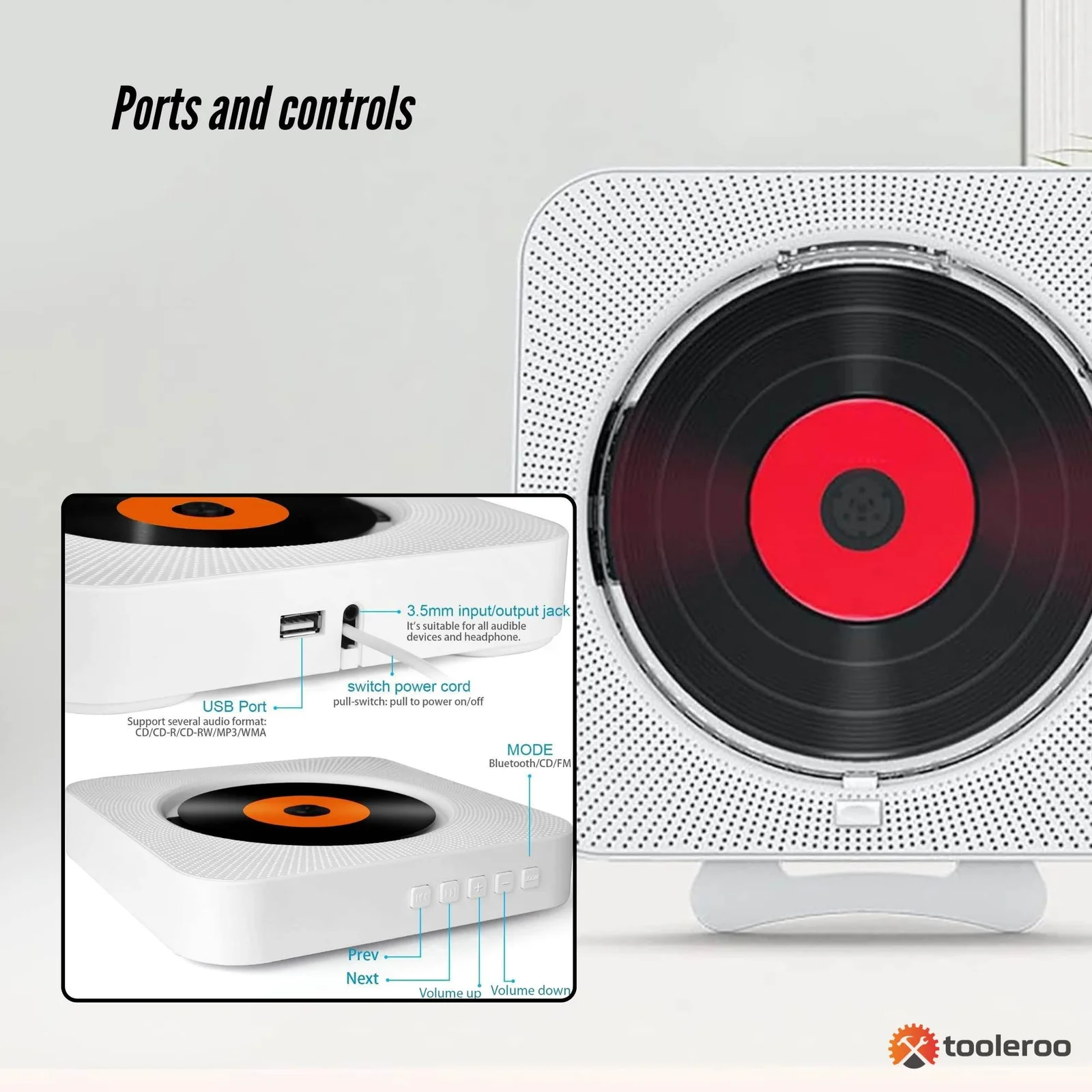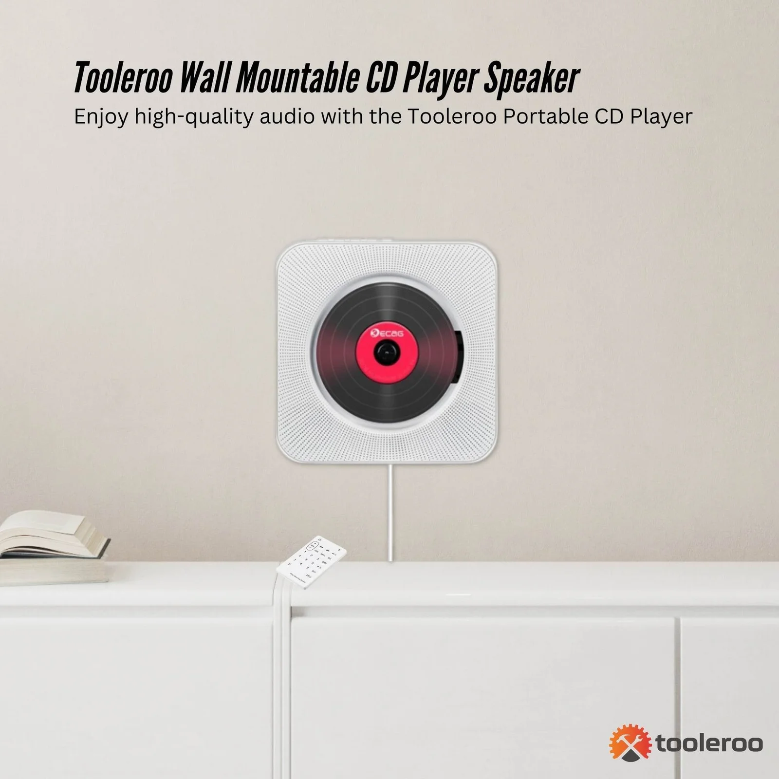 Enjoy high-quality audio with the Tooleroo Portable CD Player, featuring Bluetooth 5.1, HiFi stereo speakers, and multiple playback options. Its sleek, wall-mountable design makes it perfect for home use, with an additional desktop stand, that is lightweight and easy to adjustable. Also included is a remote control that ensures easy operation.