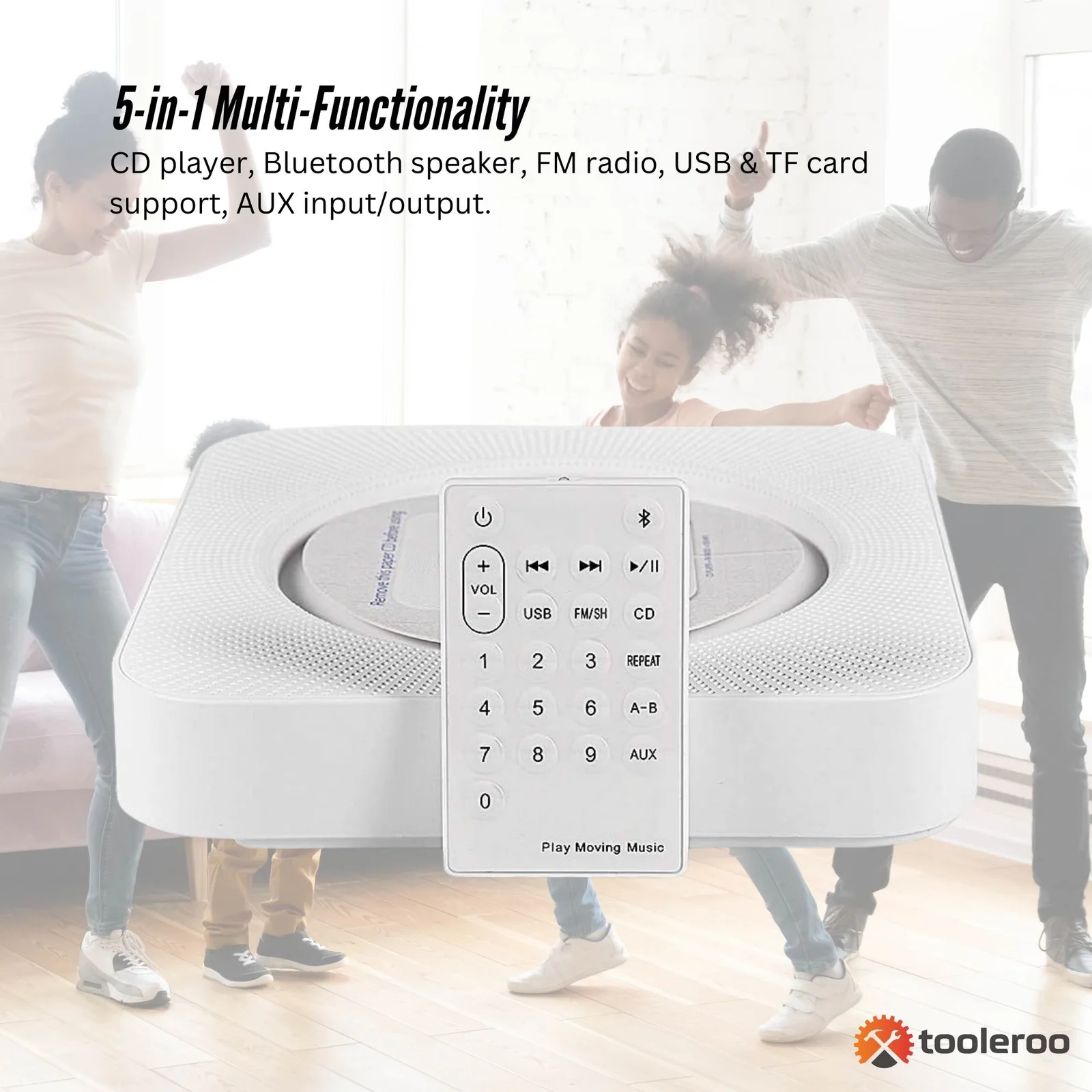 - 5-in-1 Multi-Functionality – CD player, Bluetooth speaker, FM radio, USB, and AUX input/output.