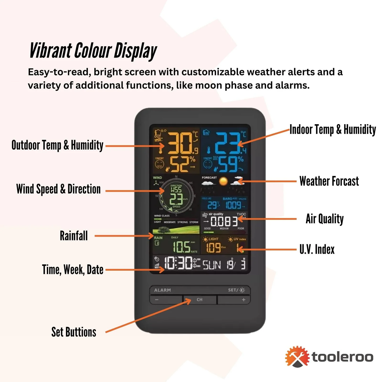 Vibrant Colour Display: The easy-to-read screen displays all your weather data with customisable 5-level backlight brightness, ensuring clarity even in low light.