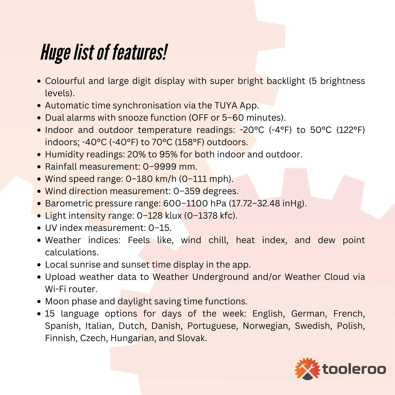 The Tooleroo Wireless 7-in-1 Weather Station is the ultimate WiFi Bluetooth Smart Weather Station, designed to provide full-function weather forecasting with precision and ease. Equipped with a comprehensive outdoor sensor, this digital clock delivers real-time data on temperature, humidity, wind speed, rainfall, UV index, and more, ensuring you're always prepared for changing conditions.