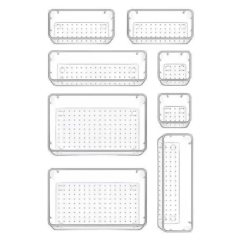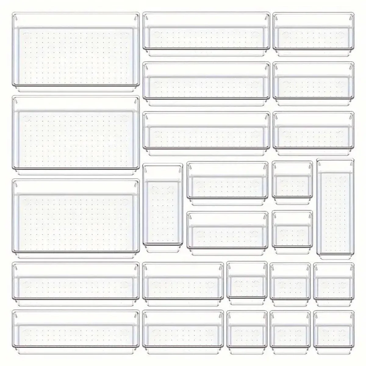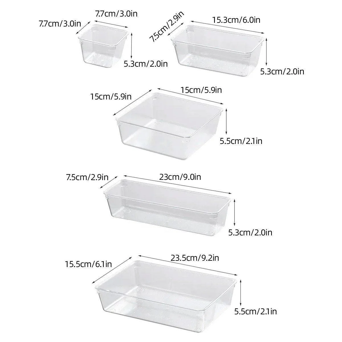 Organise your home or workspace effortlessly with this set of transparent plastic drawer organisers. Available in sets of 8, 13, or 25 pieces, these versatile containers are perfect for storing cosmetics, office supplies, bathroom essentials, kitchen accessories, and more. Crafted from durable plastic, the organisers are stackable and fit seamlessly into most standard-sized drawers, keeping everything neat and within easy reach.
