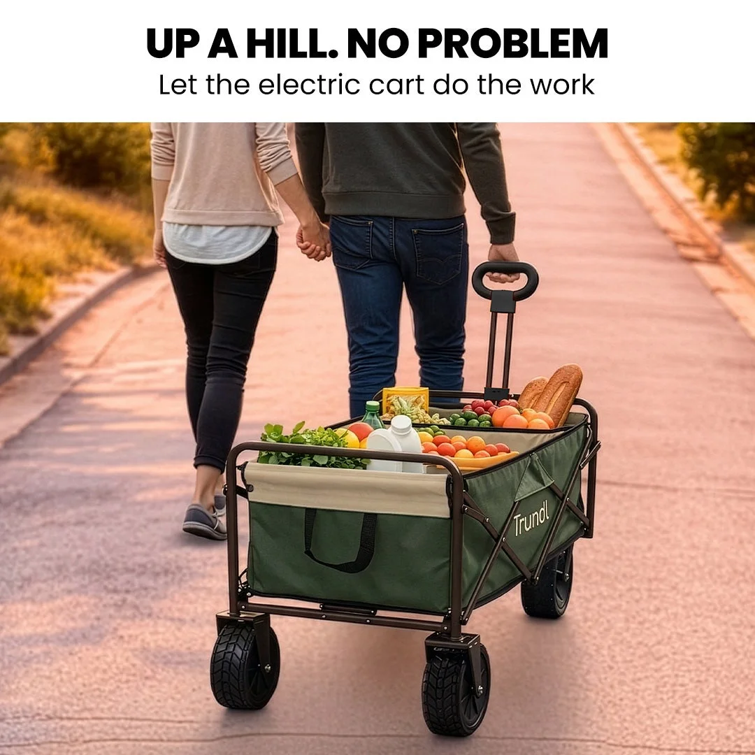 Folding down compactly for easy storage or transport, this electric pull cart is built to carry more with less effort wherever your day takes you.