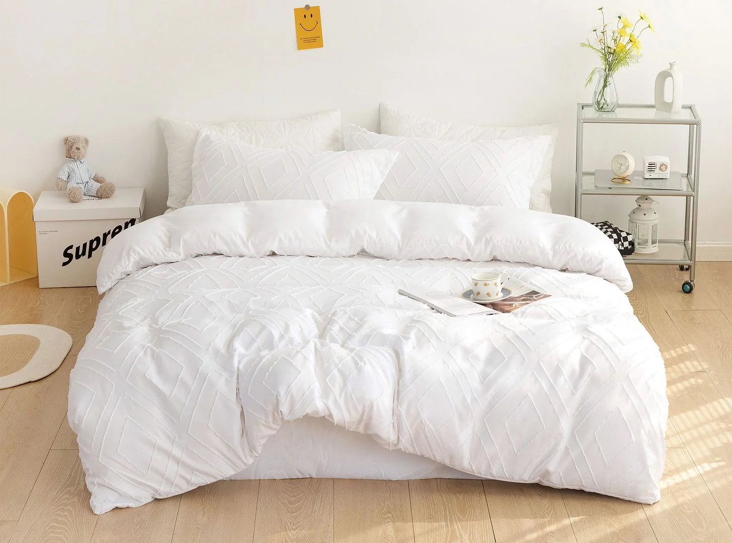 Tufted Diamond Jacquard Queen Size White Duvet Quilt Cover Set