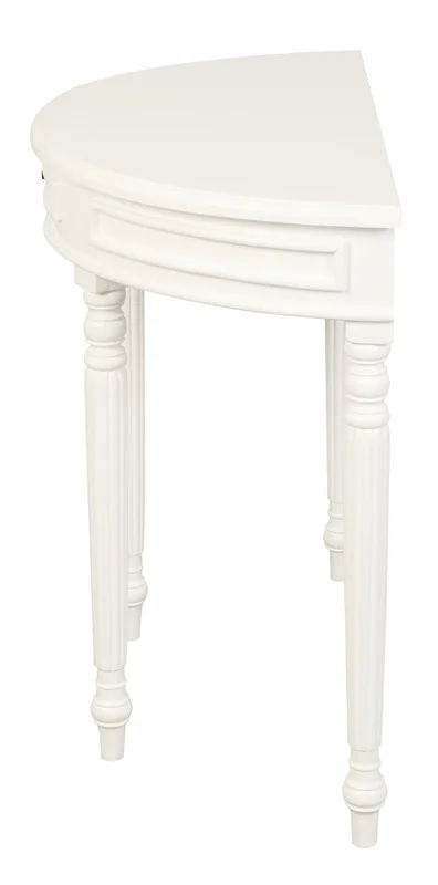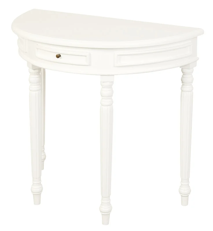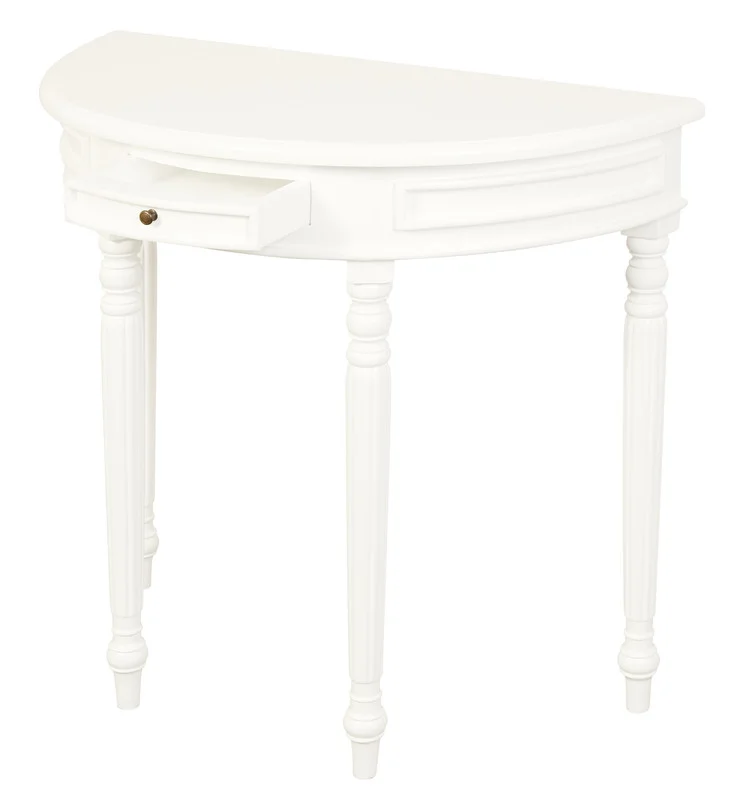 A classic demi-lune profile that slips neatly into entryways, hallways, and behind sofas. Crafted from solid Mahogany/Mindi timber (varies by finish), Huntley pairs a smooth half-round top with turned legs and a slim drawer to tidy keys and mail. The compact depth saves space while adding a polished focal point to your room.