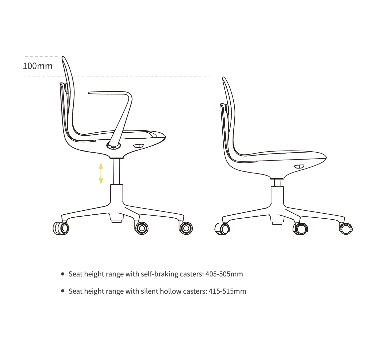 - Dimensions: Seat height range with self-braking casters: 405-505mm; Seat height range with silent hollow casters: 415-515mm