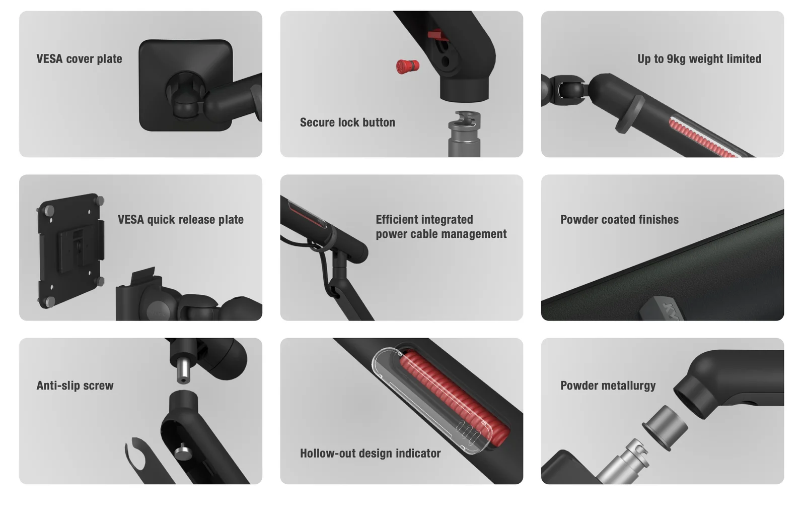 - VESA Compatibility: Adheres to VESA MIS-D 100/75 standards, accommodating a wide range of monitor brands and sizes.