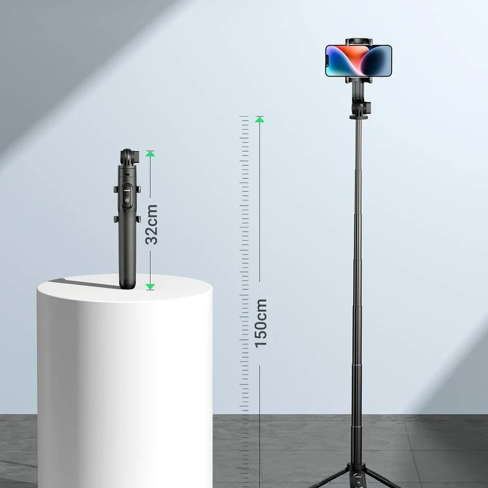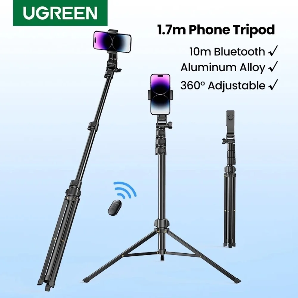 The UGREEN Selfie stick and cell phone tripod stand with remote is made from strong aluminum alloy, making it extremely sturdy. It weighs 13 oz and holds phones up to 6.8" and any camera compatible with1/4 screws.