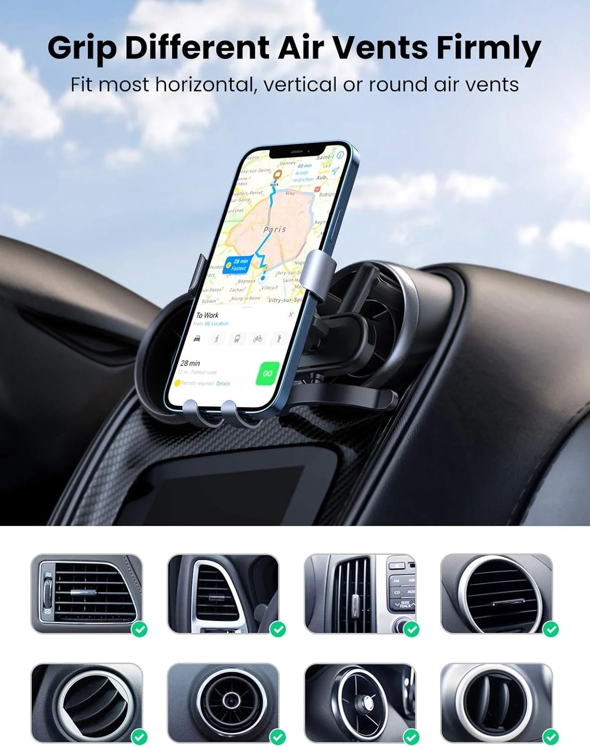 This car phone holder easily and securely fits into round air vent. The claw of the holder is made of high-quality rubber, so it will not damage your air vent even if you use it every day.