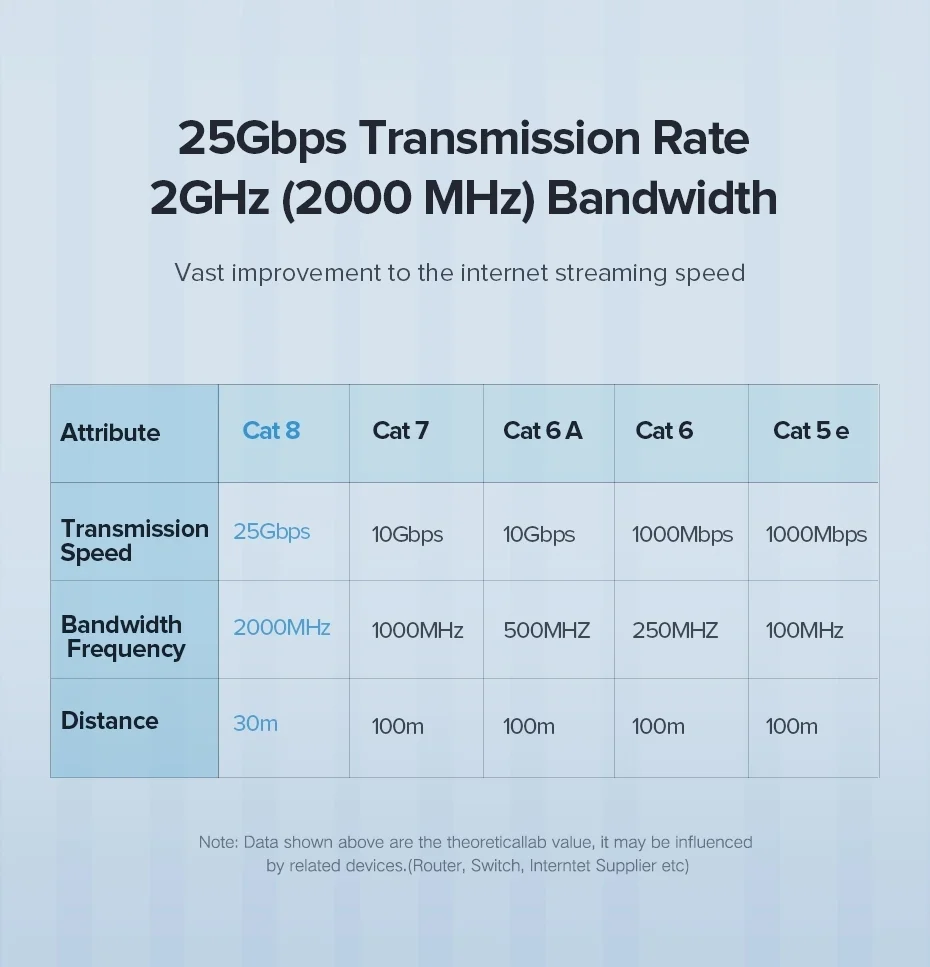 With 100% pure copper wire and gold-plated connectors, this cat8 ethernet cable can be very effective to reduce the loss during data transmission, making network speed faster and more stable.