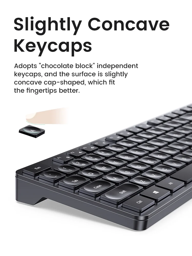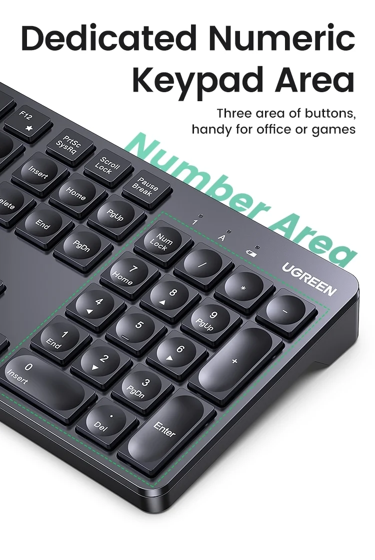 Connection type: 104-Key layout 2.4 G wireless LED indicator color: Red Power consumption: In operating mode <50 mA ; in sleep mode < 30 nA Frequency response: 2.400-2.4835 GHz Range: Up to 10 m Key layout: ANSI 104 Switch life: 10 million clicks Power supply: 1 AA battery (not included) Compatibility: Windows 7/ 8.1/ 10/ 11, macOS 10.15 and higher, iOS 13.4 and higher, iPadOS 14.0 and higher, Linux, Chrome OS, Android 5.0 Operating temperature: -5°C ~ 40°C Dimensions: 416 x 116 x 30 mm