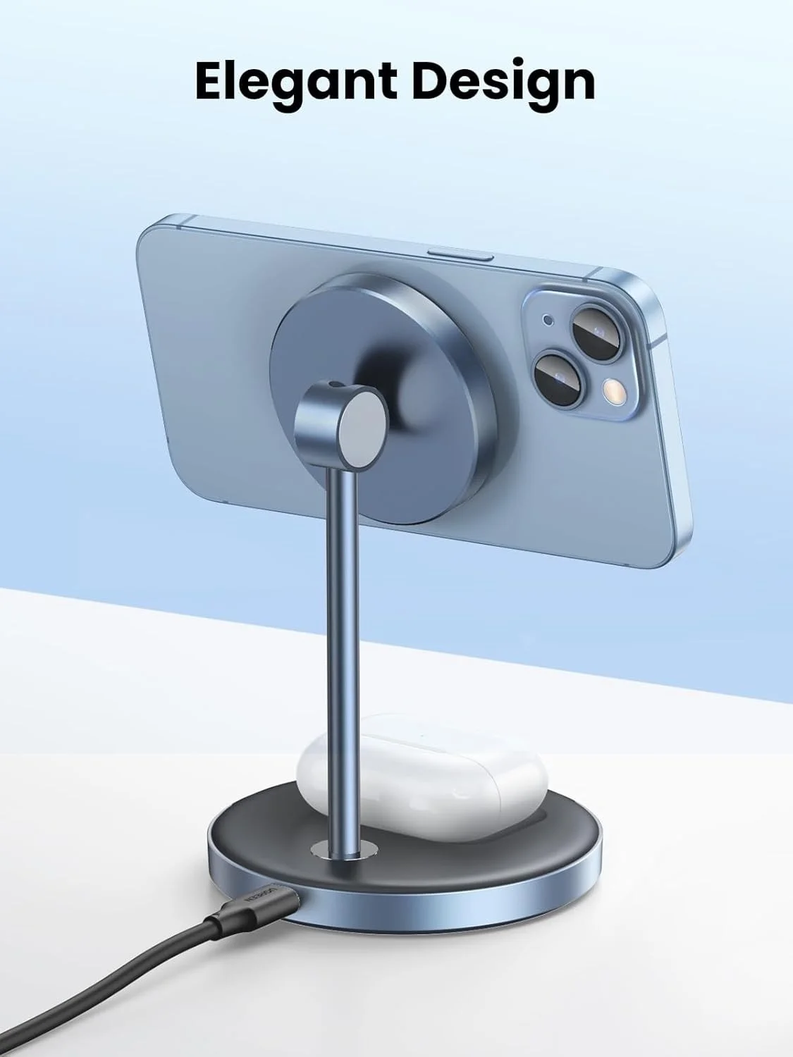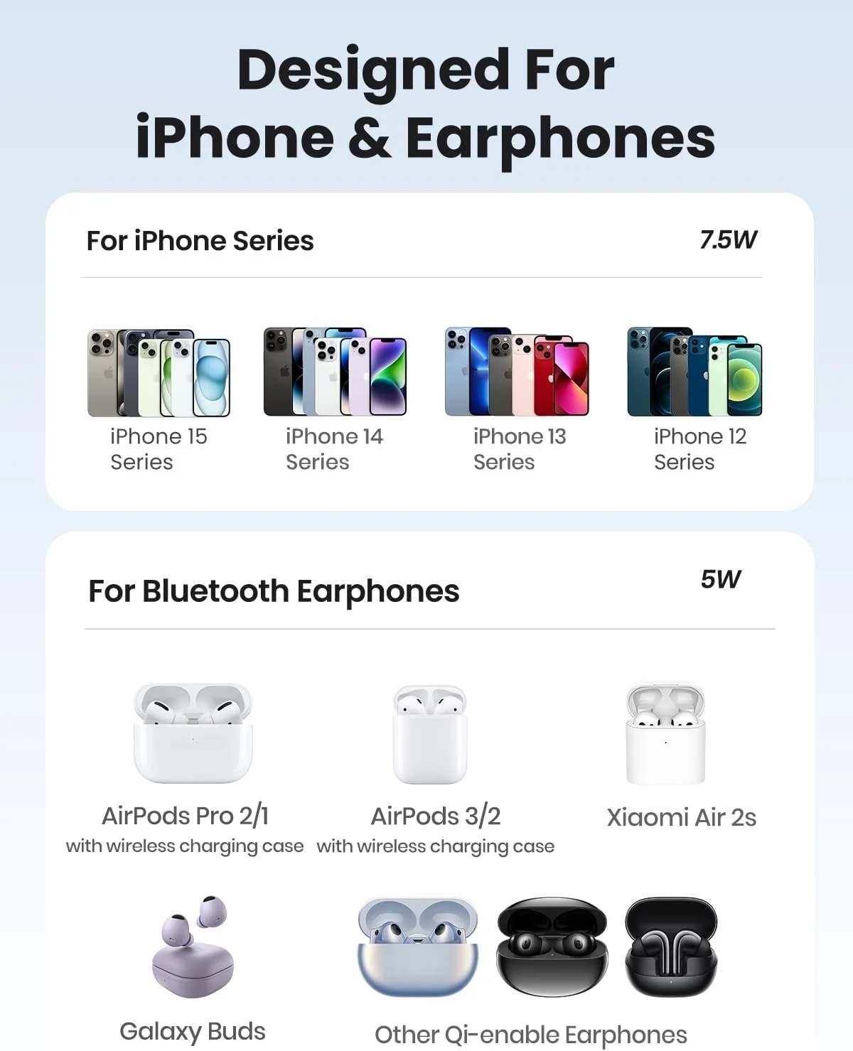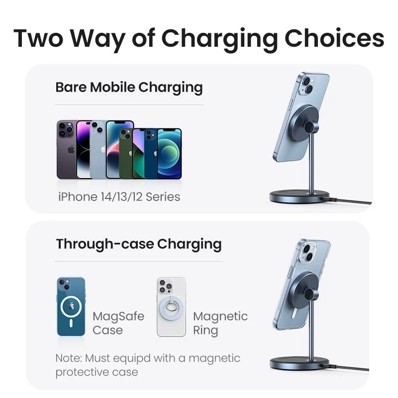 UGREEN's 2-in-1 wireless charging station is designed for iPhone 15/14/13/12 series (7.5W) and AirPods Series (5W). The magnetic stand charges your iPhone and AirPods at the same time. NOTE: maximize charging efficiency of the 2-in-1 wireless charger by using a Type-C PD 20W charging adapter or greater (not included); Airpods 1 is not supported. For other types of Airpods, please ensure that it has the wireless charging case instead of the lightning case.