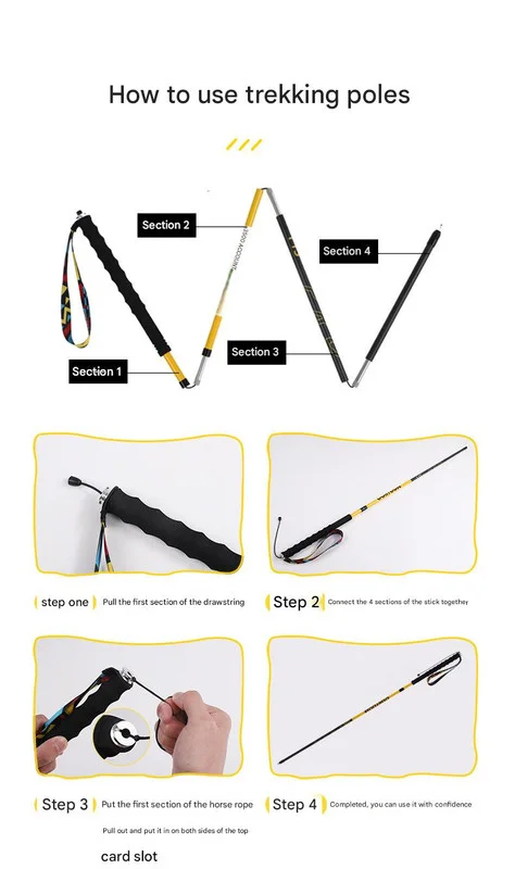 Engineered for trail running and ultralight hiking, this high-performance trekking pole provides the support and stability needed to conquer challenging terrains. Constructed from high-strength 30T composite carbon fiber with over 99% carbon content, it is exceptionally lightweight (approx. 115g) and more durable than standard carbon fiber poles. Its quick-deploy Z-fold design allows for rapid assembly, while the extended, sweat-absorbent EVA foam handle ensures a comfortable and secure grip on varied inclines. Featuring a reinforced aluminum alloy inner tube at the joints to absorb impact and a tough, replaceable tungsten steel tip for solid traction, this pole is built for performance and endurance.