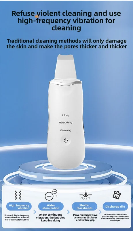 Transform your daily skincare regimen with this advanced facial spatula. Traditional manual extraction can be harsh and cause redness, but this ultrasonic scrubber offers a gentler alternative. By keeping your face wet and gliding the stainless steel spatula across your skin, you can visibly see impurities being atomised and removed. It is particularly effective for the T-zone and nose area, helping to refine skin texture and reduce the appearance of pores.