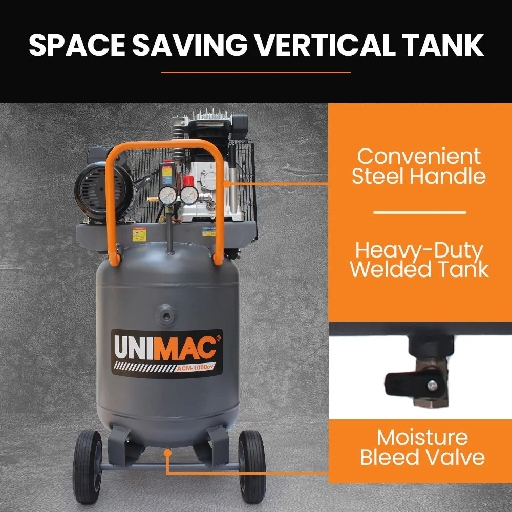 The Unimac ACM-1000cv Belt Driven Air Compressor combines strength, durability, and efficiency to meet the needs of professionals and serious DIYers.