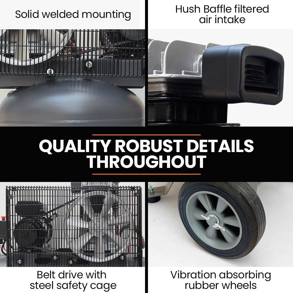 The vertical tank design saves space. It takes less floor space making it a smart solution in smaller shops and garages. The large 100L capacity steel tank ensures extended run times. The durable tank construction is built to withstand rigorous use, and the welded cast steel cylinder chamber has welded outlet and inlet ports and a welded moisture bleed port with an easy-to-use quarter-turn valve