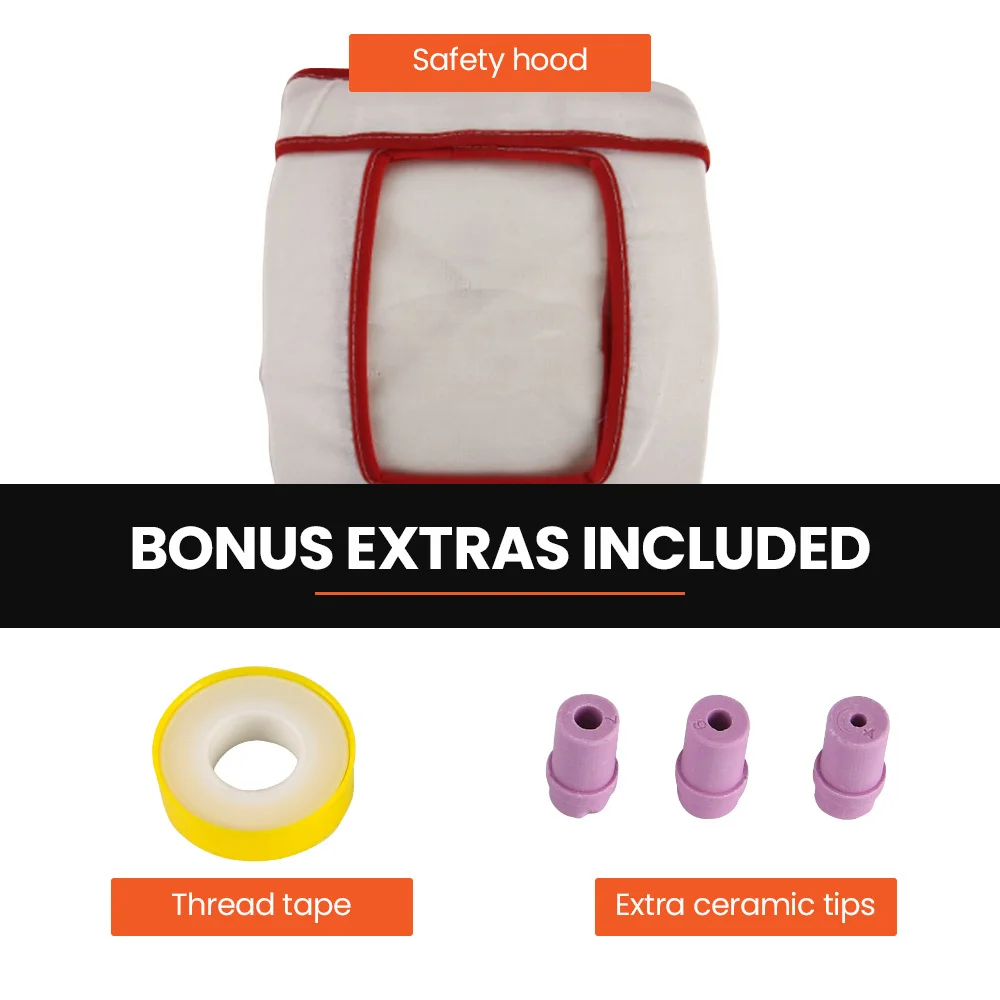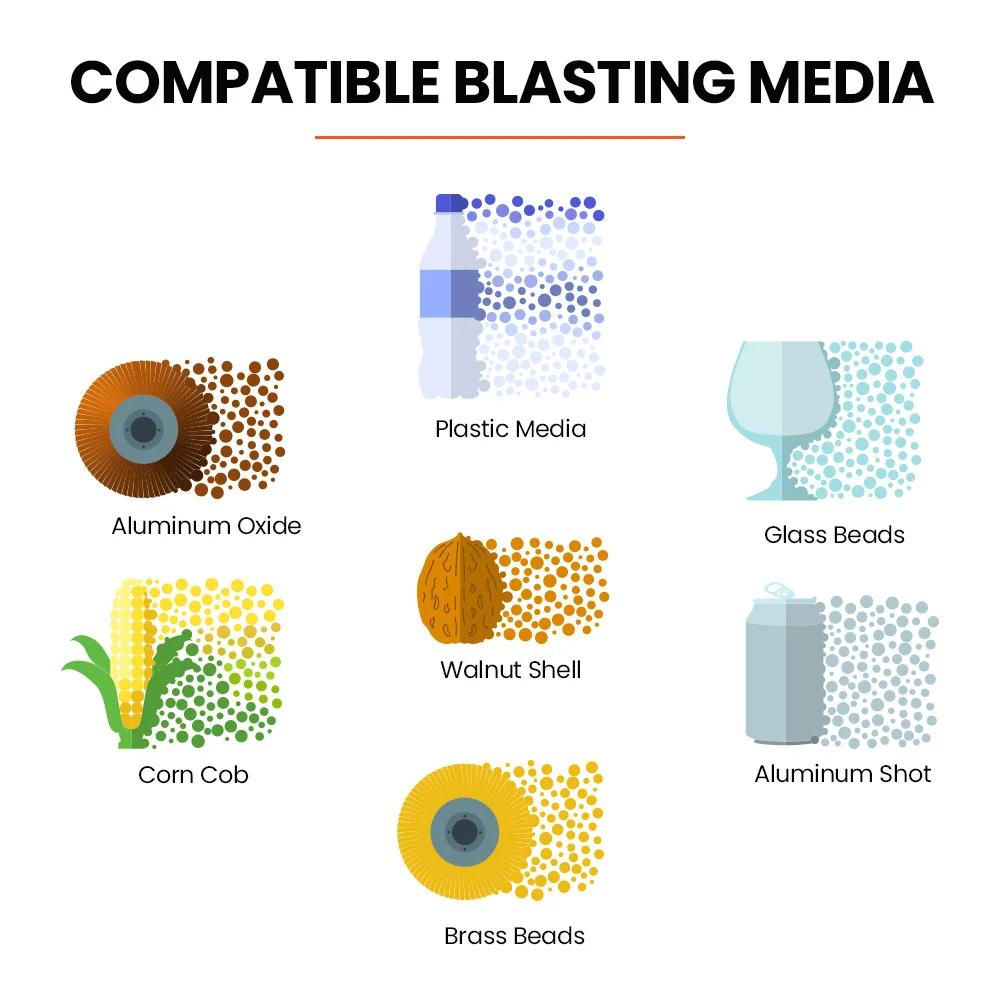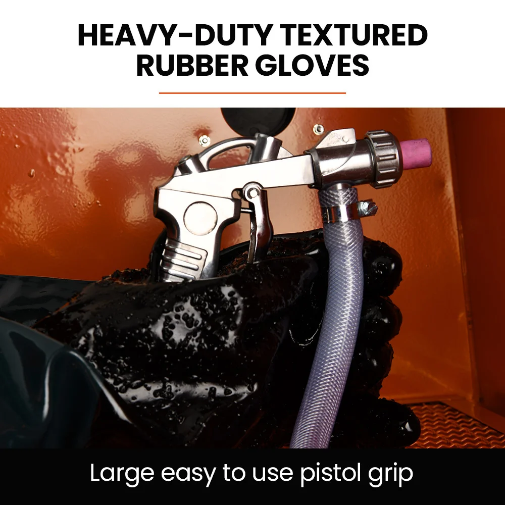 The moulded protective gloves ensure safe handling, while the internal LED light provides optimal visibility for your work. It includes 4, 5, 6, and 7mm nozzles, allowing for a wide range of blasting medium choices. Plus, with a nominal operating pressure of 40 - 80 PSI with a minimum of 5 CFM and a max pressure of 120 PSI, you can adjust the blasting strength to suit your needs.