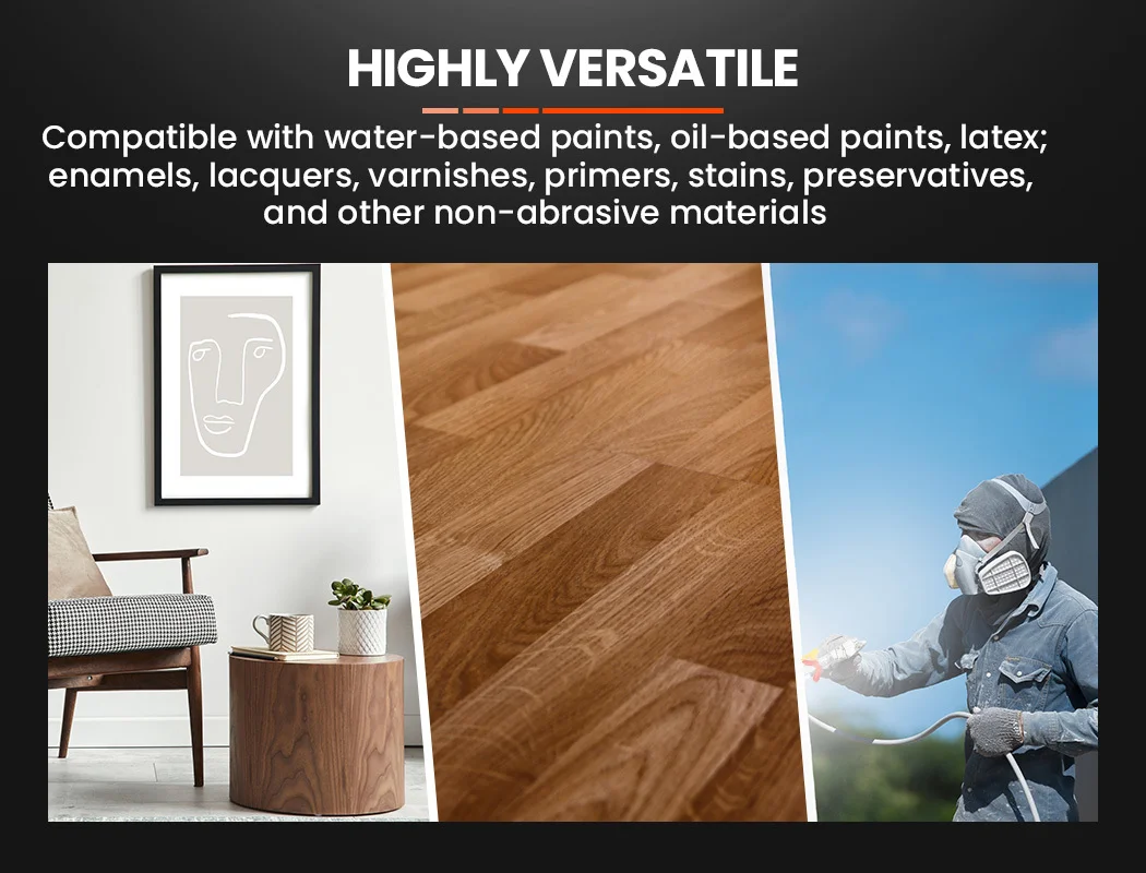 The compact yet powerful 740W airless model is built to cater to all jobs, big or small, and turns hours of tedious work into an enjoyable, free flowing painting experience. Its compact size means the station takes up minimal space when not in use, and its versatile design means it’s able to spray a wide range of coating liquids with perfection, including water-based paints, oil-based paints, latex; enamels, lacquers, varnishes, primers, stains, preservatives, and other non-abrasive materials.