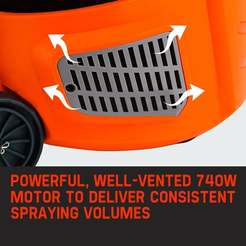 The 740W model has all the features and grunt to get you spraying a whole host of surfaces with seamless precision. Because of its high 70 DIN-s viscosity range, its able to apply a wide range of coating liquids with perfection, including gloss paints; primers; mordants; 2 component paints; clear varnishes; water-dilutable gloss paints; motor-vehicle enamels; wood preservatives, and many more! Not only does it allow you to spray various coatings, it will coat tricky surfaces such as brickwork and latticework that rollers and brushes struggle with.