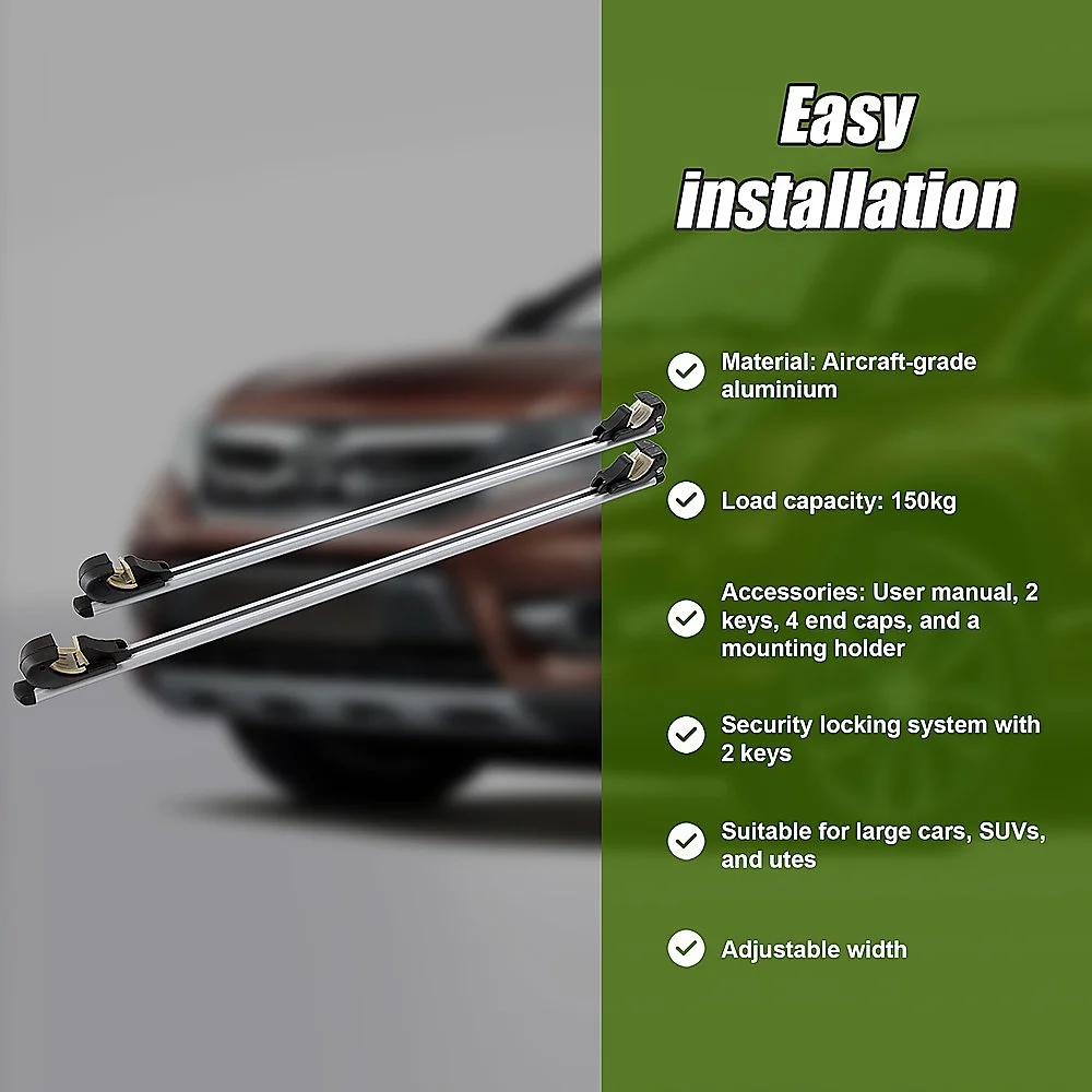 No worries about theft. This rack features an anti-theft security lock with independent keys. It's sturdy enough that you can take it off-road with confidence. It's perfect for larger cars, SUVs, and utes with raised roof rails that are up to 117 cm apart, with a minimum of 30 mm between the rails and roof. If your car, SUV, or ute fits this description, it's the perfect solution to family members who just can't pack light. It's also an ideal way to store extra equipment on business trips, holidays, or weekend camping trips. Don't wait for the summer to arrive before you buy. Get yours today!
