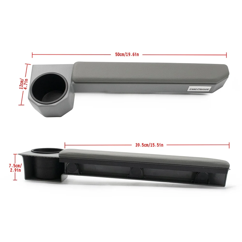 These arm rest cups holders fit the 70 series Toyota Land-cruiser, they accommodate both large and small diameter cups/bottles snugly with a removable rubber seal.