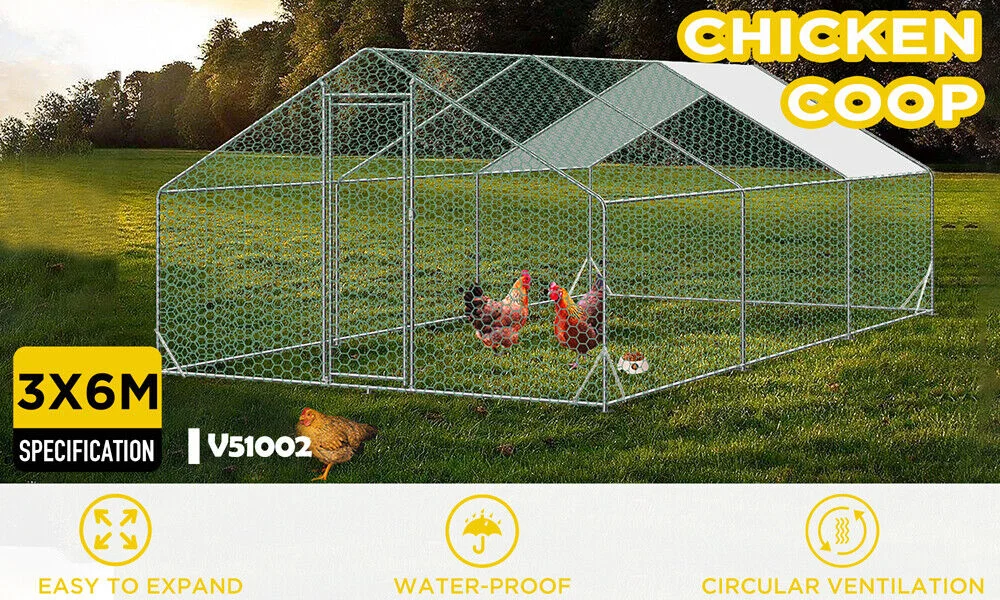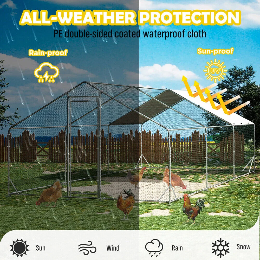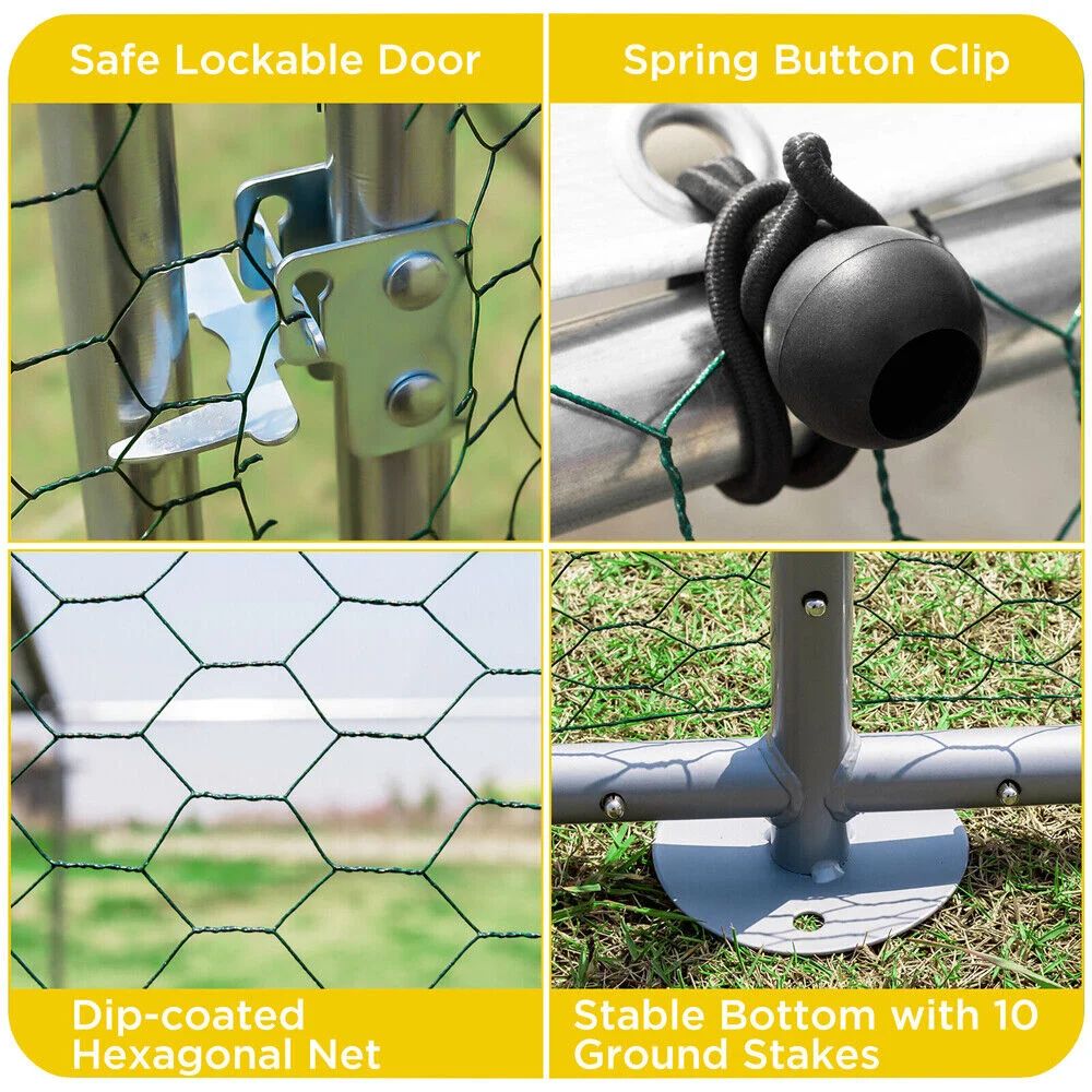 Still finding a large cage for your chickens? Our walk-in pen run is your perfect choice!This chicken coop is designed with lockable door and close hexagonal mesh, both of which prevent your pets from escaping and protect them from predators. Moreover, you dont really need to worry about what if bad weather comes because the sturdy galvanized metal frame with ground stakes ensure reliable stability to well withstand rigorous conditions. The waterproof and sun-protective oxford cover also helps create a cozy living environment for poultry. And water, snow and debris can run off the spire-shaped roof easily. All in all, our large poultry cage is a safe and comfortable shelter for chickens, ducks, rabbits, dogs and other animals.