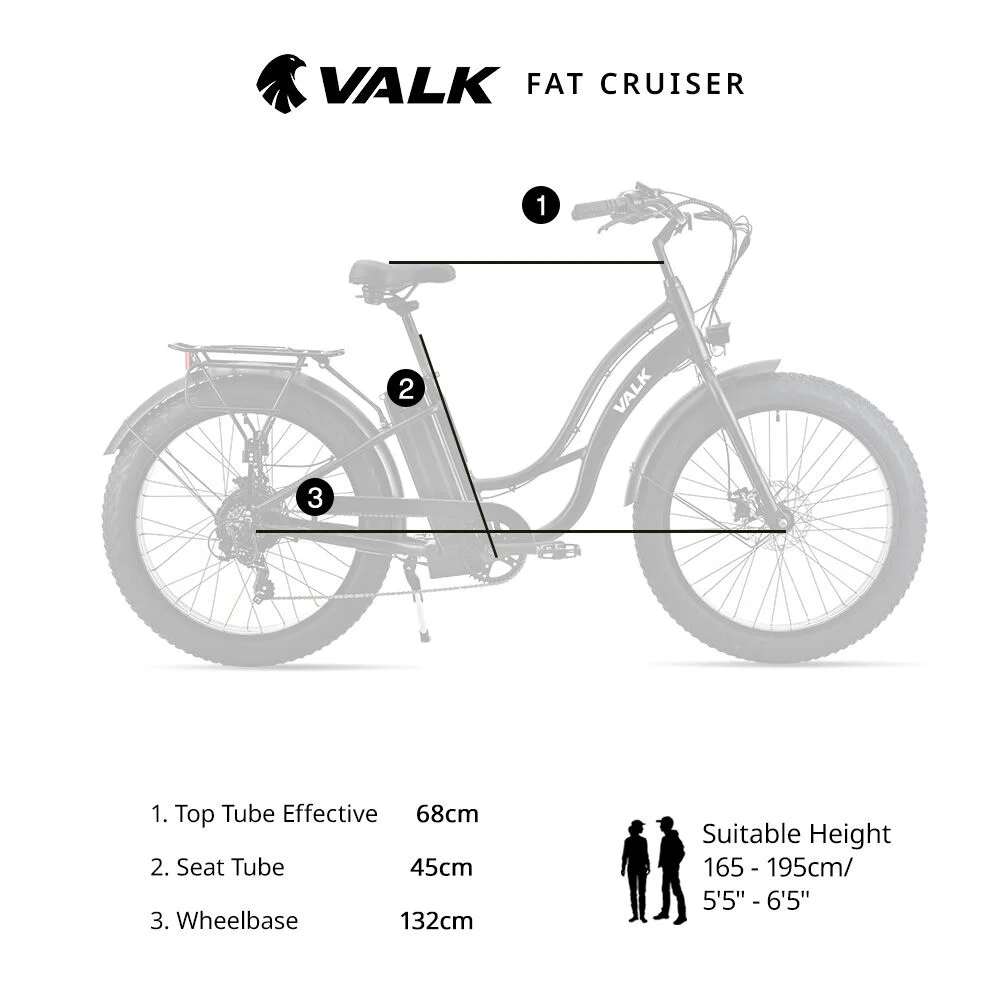 The Valk Fat Cruiser ebike has everything you need for an awesome relaxed ride. With 26 inch wheels wrapped in 4 inch wide tyres there are few limits to where you can explore.