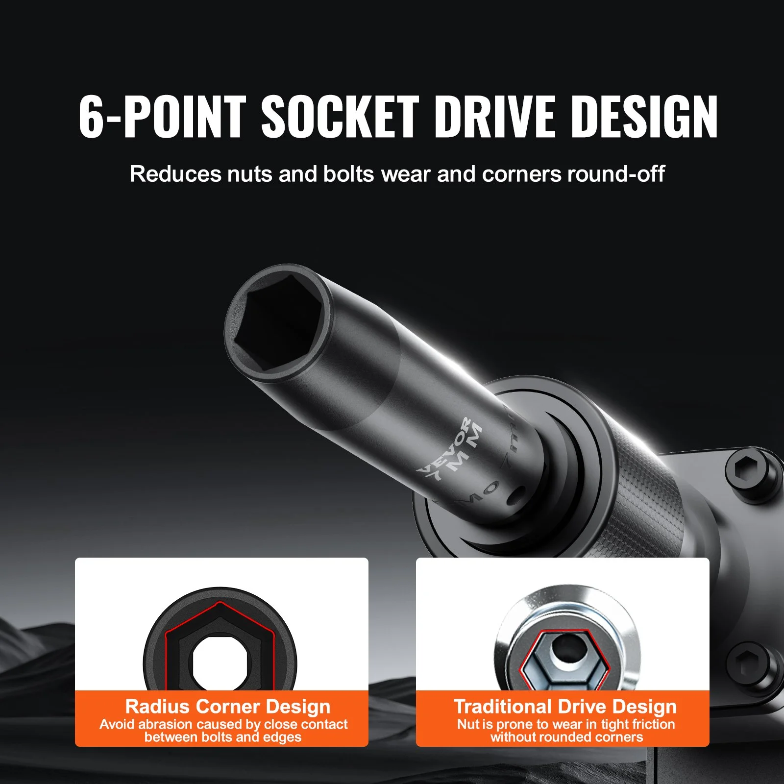 Distinguished by its hexagonal drive design, which sets it apart from traditional designs lacking rounded corners, this socket tool set significantly reduces pressure exerted on fasteners during impact. As a result, it minimizes wear and effectively prevents bolt rounding and stripping.
