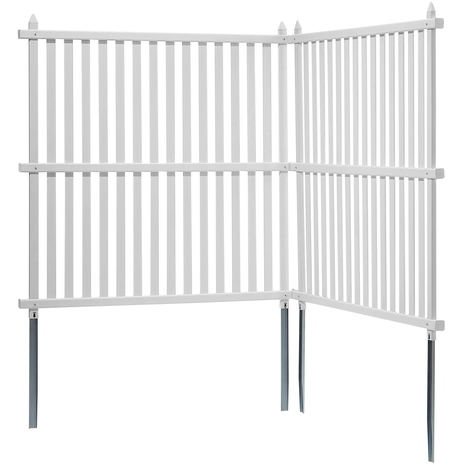 This premium vinyl fence panel comes with pointed metal ground stakes, suitable for various soft grounds such as soil, gravel, or sand. No need the tedious digging, saving both time and effort. The extended metal stakes provide exceptional support, ensuring stability and safety for prolonged use.