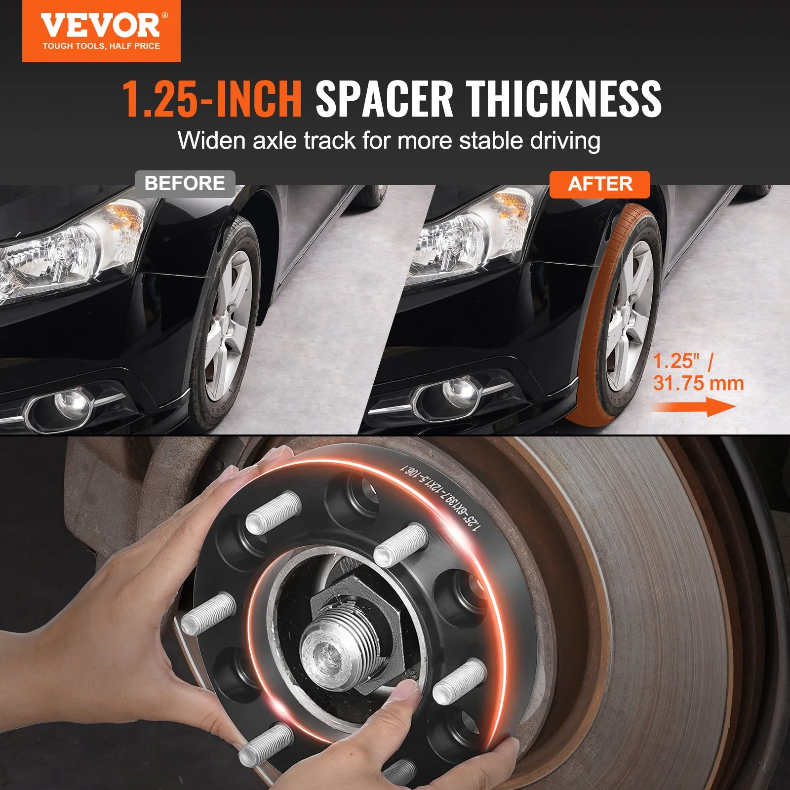 These wheel spacers increase the axle track by 1.25 inch, widening the wheel track to lower the vehicle's center of gravity. This effectively solves severe body sway during high-speed cornering, significantly improving the vehicle's grip, stability, and handling.