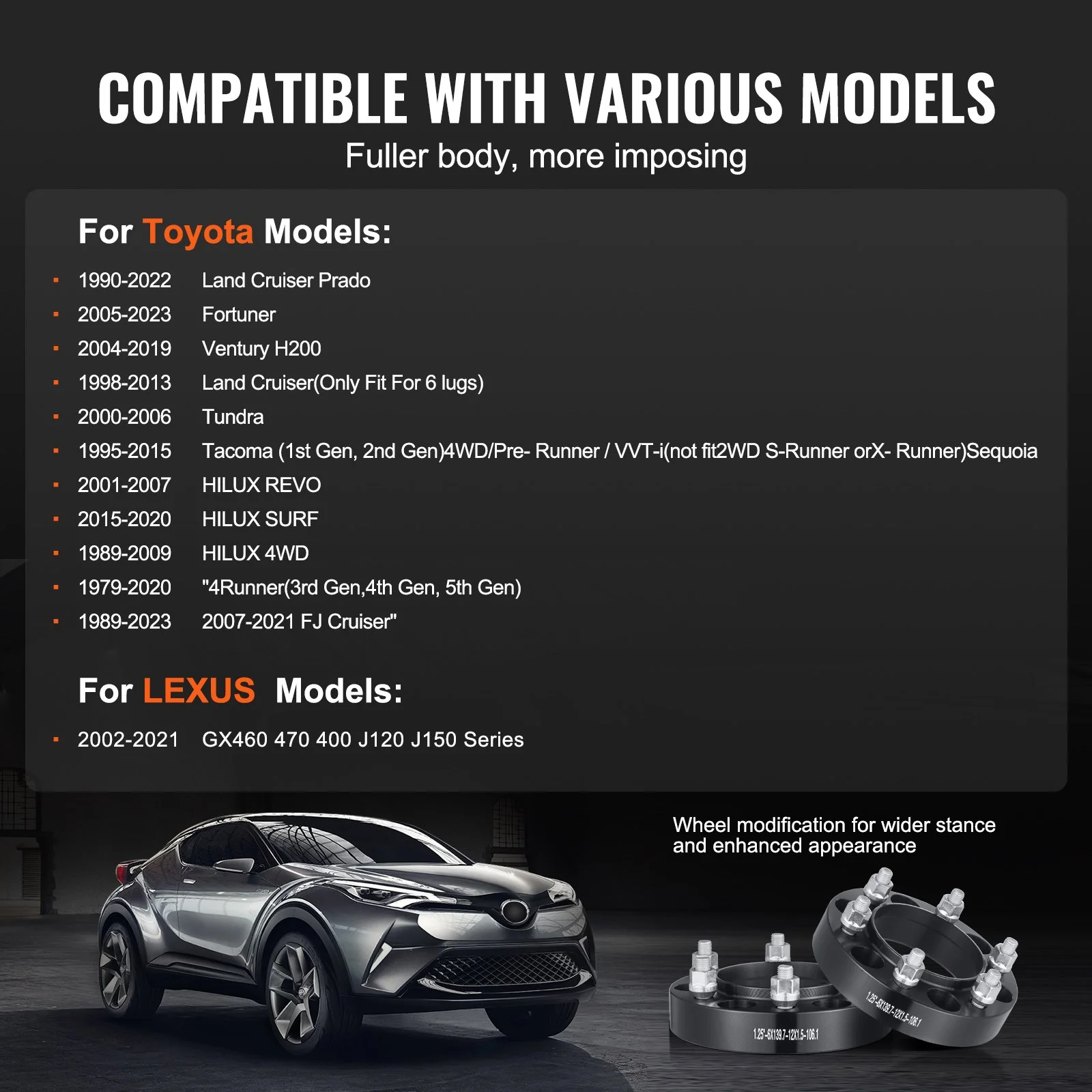 These wheel spacers are compatible with many Toyota and Lexus vehicles from 1979 to 2023, including: Toyota: 1990-2022 Land Cruiser Prado, 2005-2023 Fortuner, 2004-2019 Ventury H200, 1998-2013 Land Cruiser (Only Fit For 6 lugs), 2000-2006 Tundra, 1995-2015 Tacoma (1st Gen, 2nd Gen) 4WD/Pre-Runner/VVT-i (not fit 2WD S-Runner or X-Runner), 2001-2007 Sequoia, 2015-2020 HILUX REVO, 1989-2009 HILUX SURF, 1989-2020 HILUX 4WD, 1989-2023 4Runner (3rd Gen, 4th Gen, 5th Gen), 2007-2021 FJ Cruiser. LEXUS: 2002-2021 GX460 470 400 J120 J150 Series.