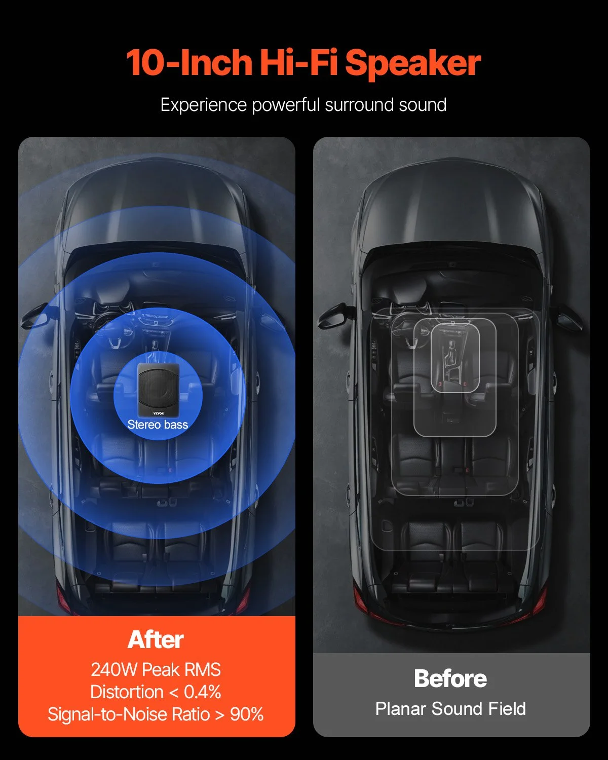 Our ultra-slim 3.0-inch under seat car subwoofer, with a built-in amplifier, fits seamlessly under your car seat, maximizing space while enhancing your car audio system. Enjoy deep, powerful bass and immersive sound quality, making every drive more enjoyable.