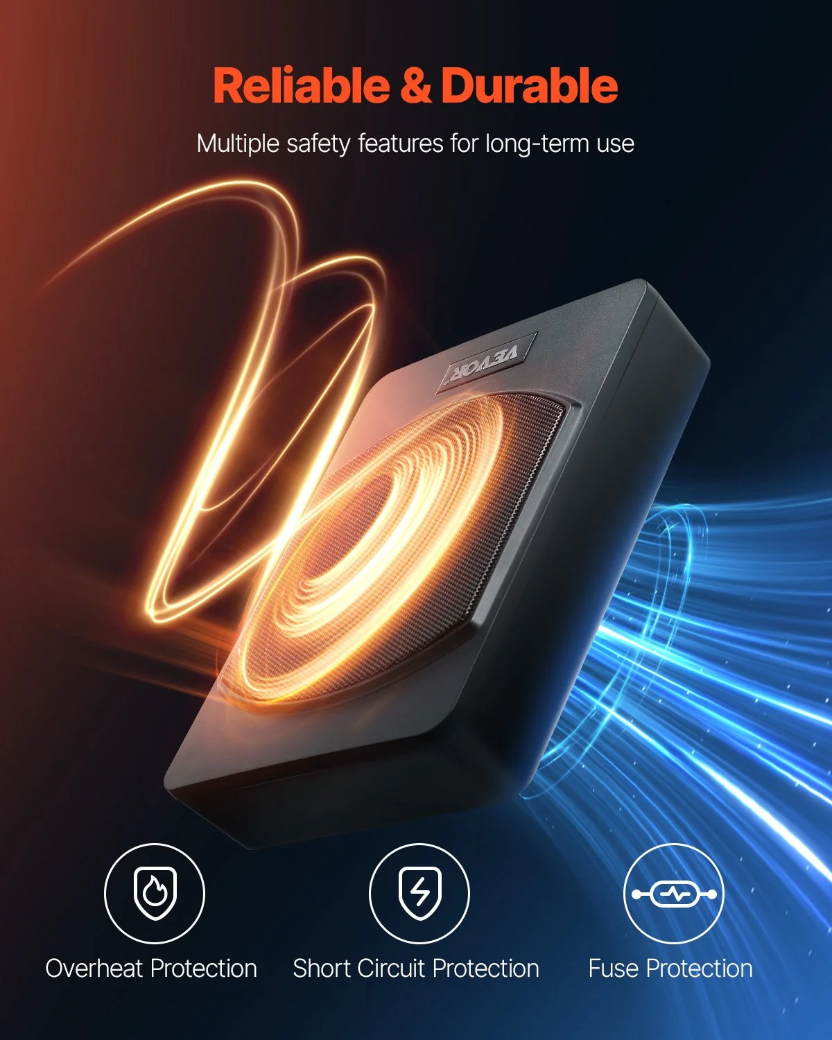 This powered subwoofer for car truck is equipped with multiple built-in safety features, including overheat, short circuit, and fuse protection, ensuring reliable, long-lasting performance. And the aluminum alloy shell enhances heat dissipation, preventing overheating and significantly extending the subwoofer's lifespan.