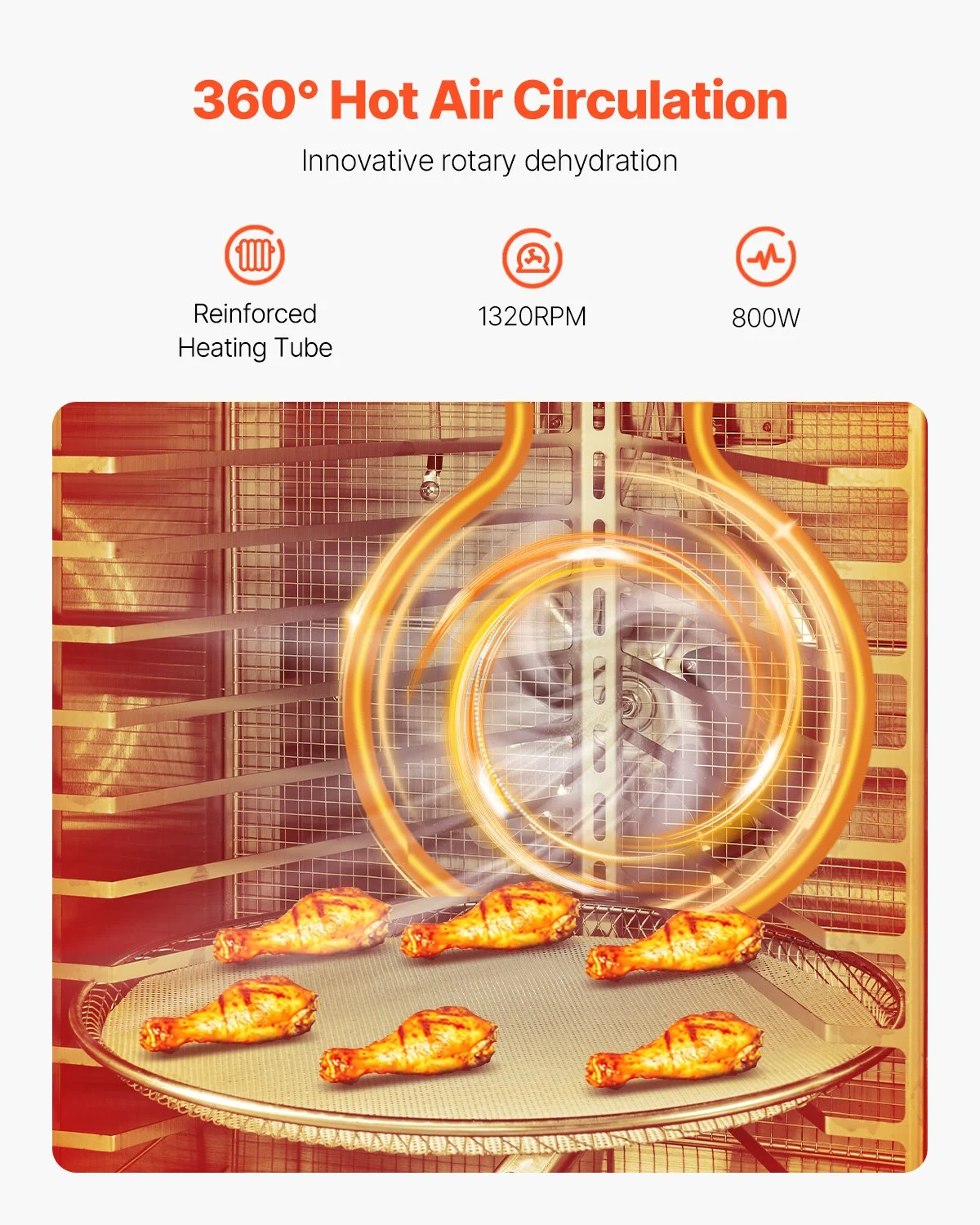 The innovative rotary dehydration, dual fans and a circulating airflow design ensure even heat and airflow distribution. This food dehydrator machine even dries various ingredients while preserving nutrients without loss