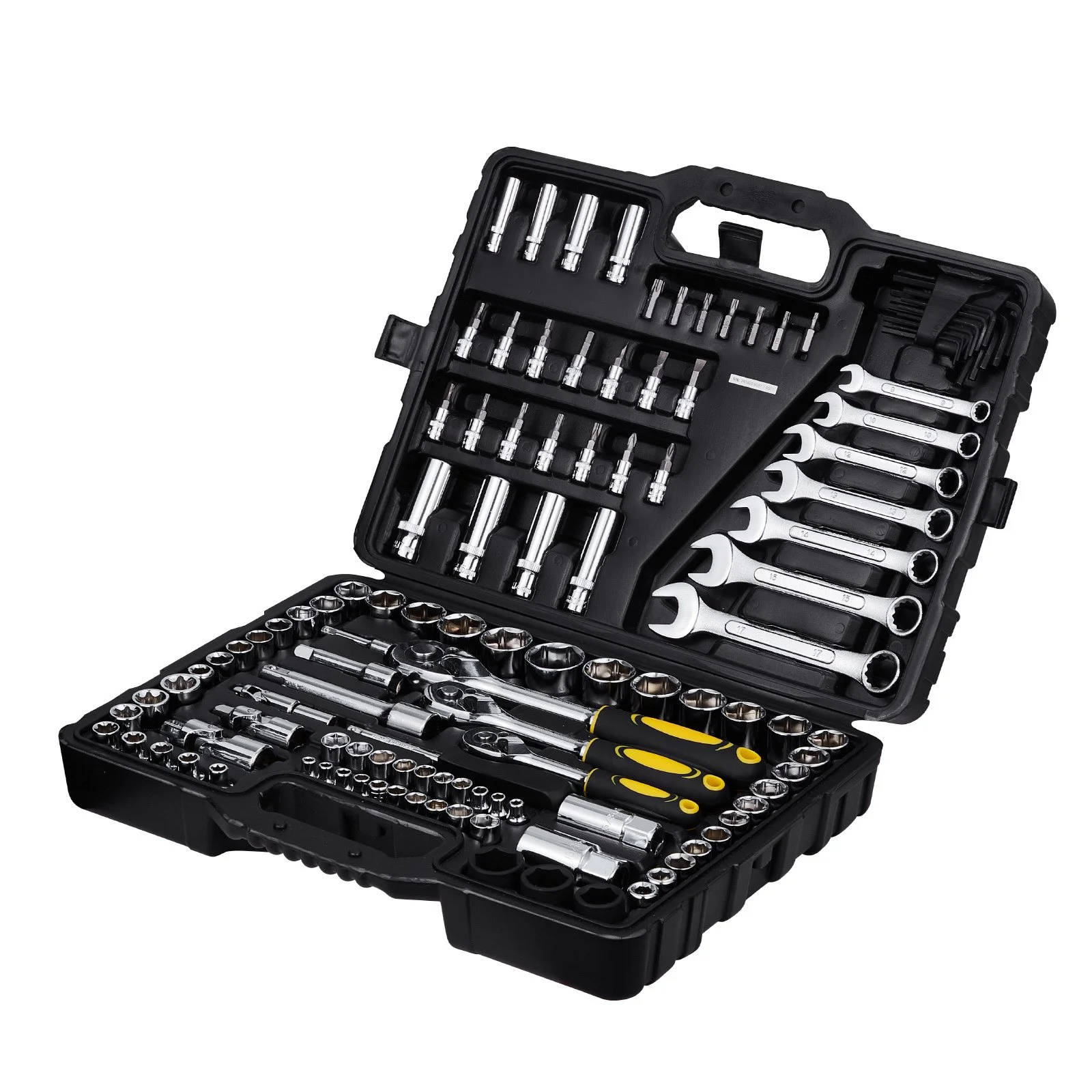 This 121-piece mechanics tool set includes SAE and metric sizes of 1/2", 3/8", and 1/4" drive sockets, ratchet handles, hex wrenches, extension bars, bits and universal joints, making it perfect for handling complex repair jobs.