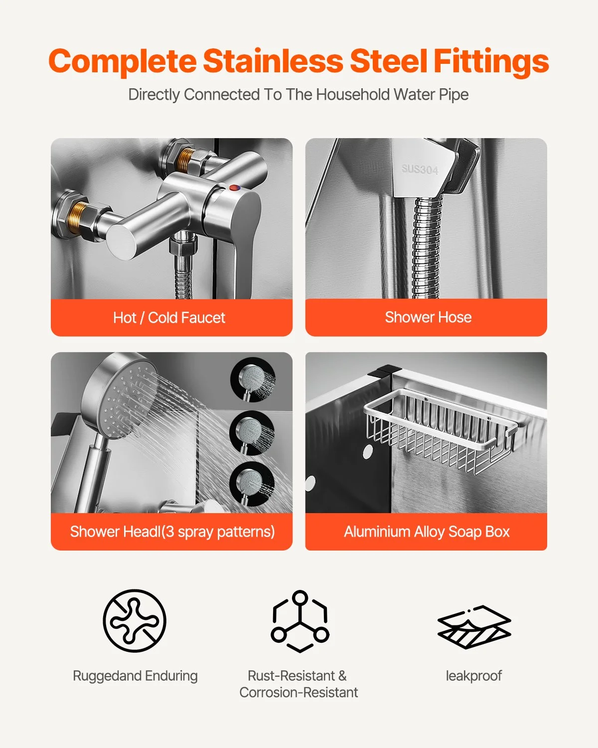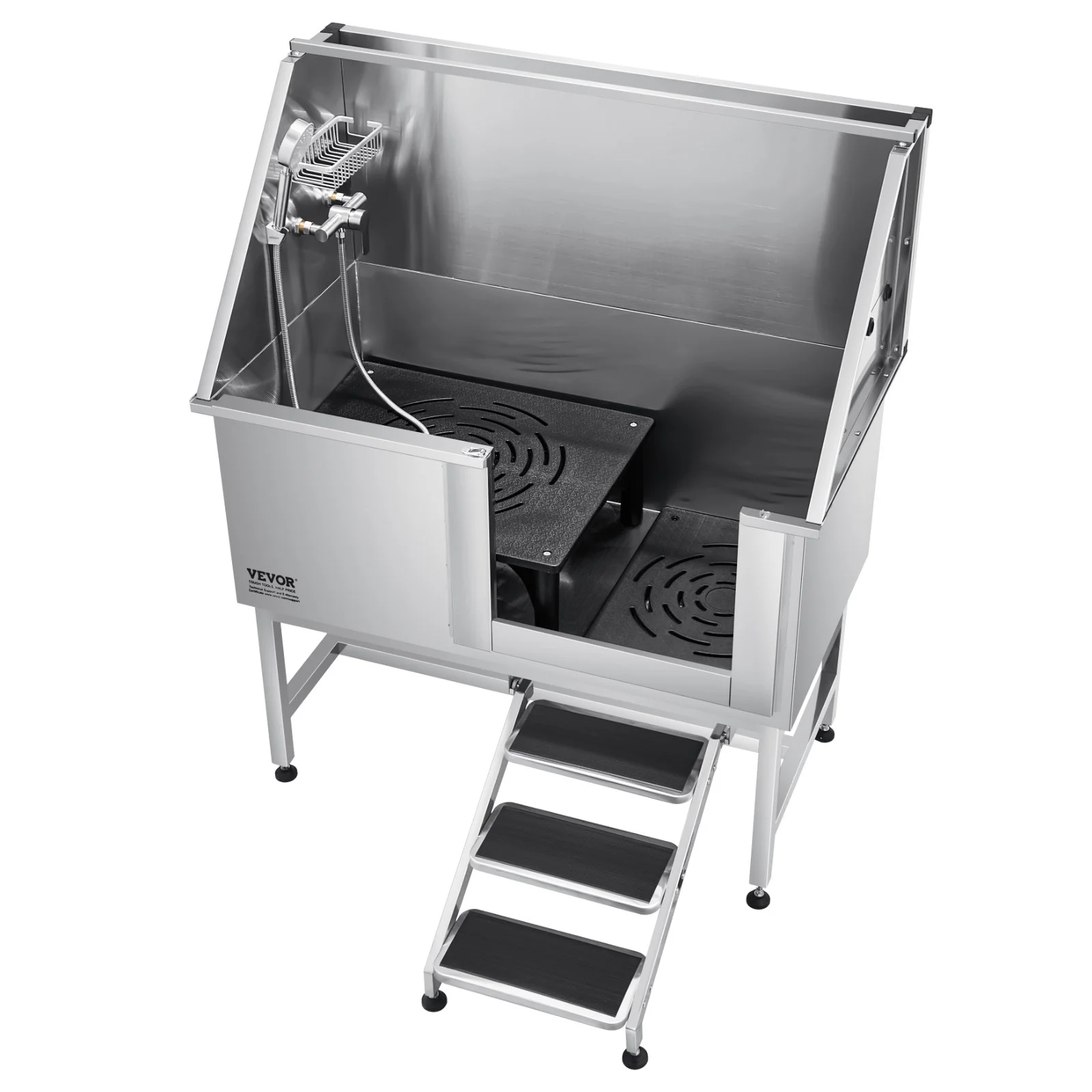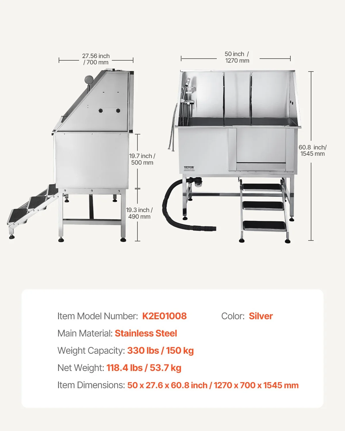 The dog grooming tub is featuring hot and cold faucets, a dual-control showerhead, and a soap holder, this design makes pet bathing effortless and efficient. The PE water filter board provides a non-slip draining surface, while the included duckbill buckle stops pets from accidentally triggering the door during bath time, keeping them securely inside
