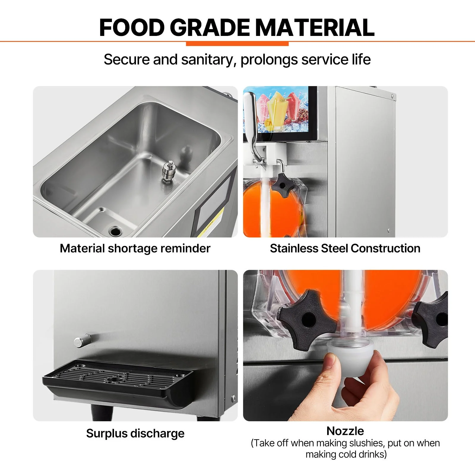 This frozen drink machine can make many different types of drinks, such as margaritas, slushies, frozen coffee, alcoholic drinks, fruit drinks, and smoothies. Ideal for restaurants, bars, weekend parties, tea house distilleries, and nail salons. Perfect for home and commercial use.