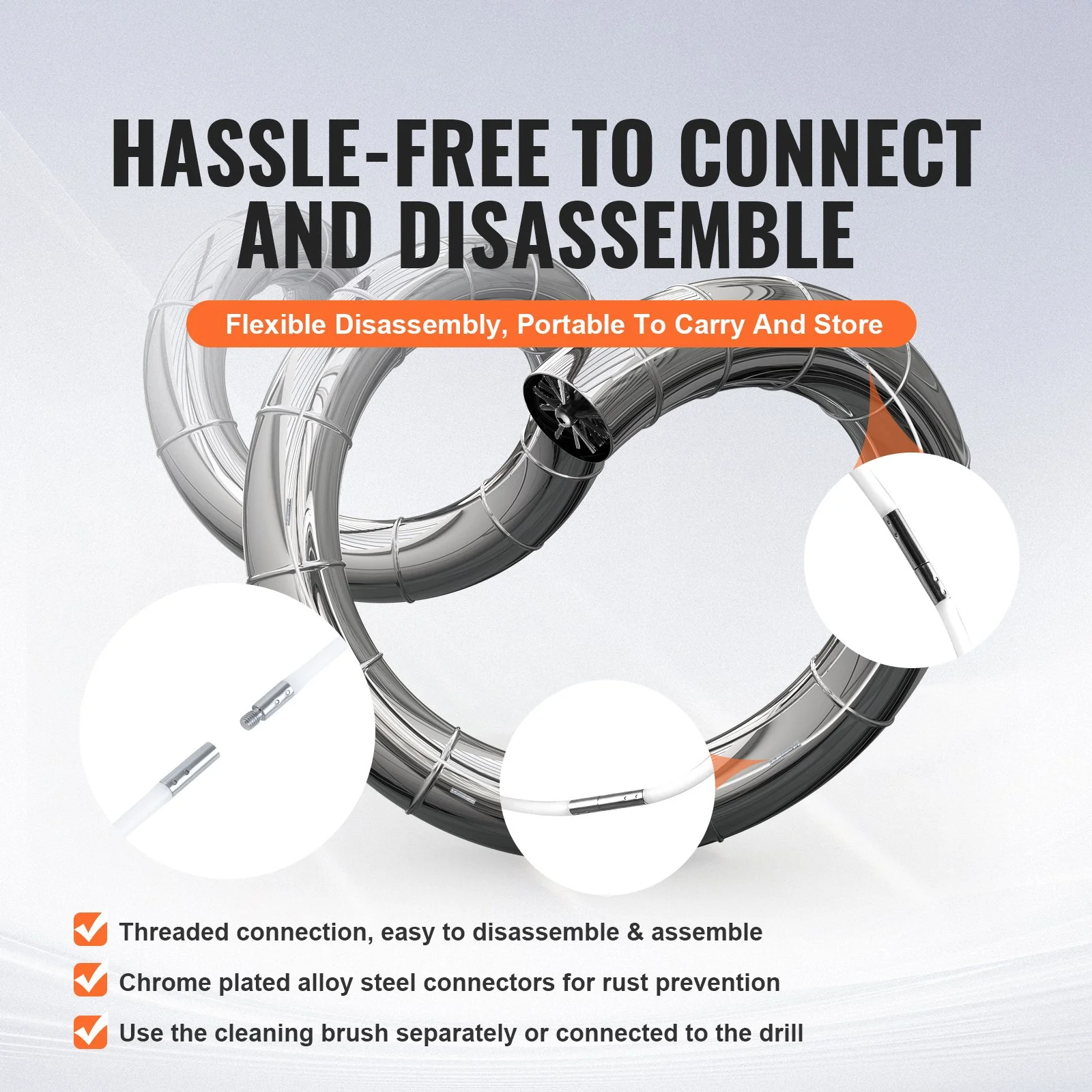 This pipe cleaning brush can quickly extend up to 50 feet, allowing you to easily reach distant or deep sections of pipes, such as those running through roofs, basements, and attic spaces. By expanding the cleaning range, it greatly enhances cleaning efficiency.
