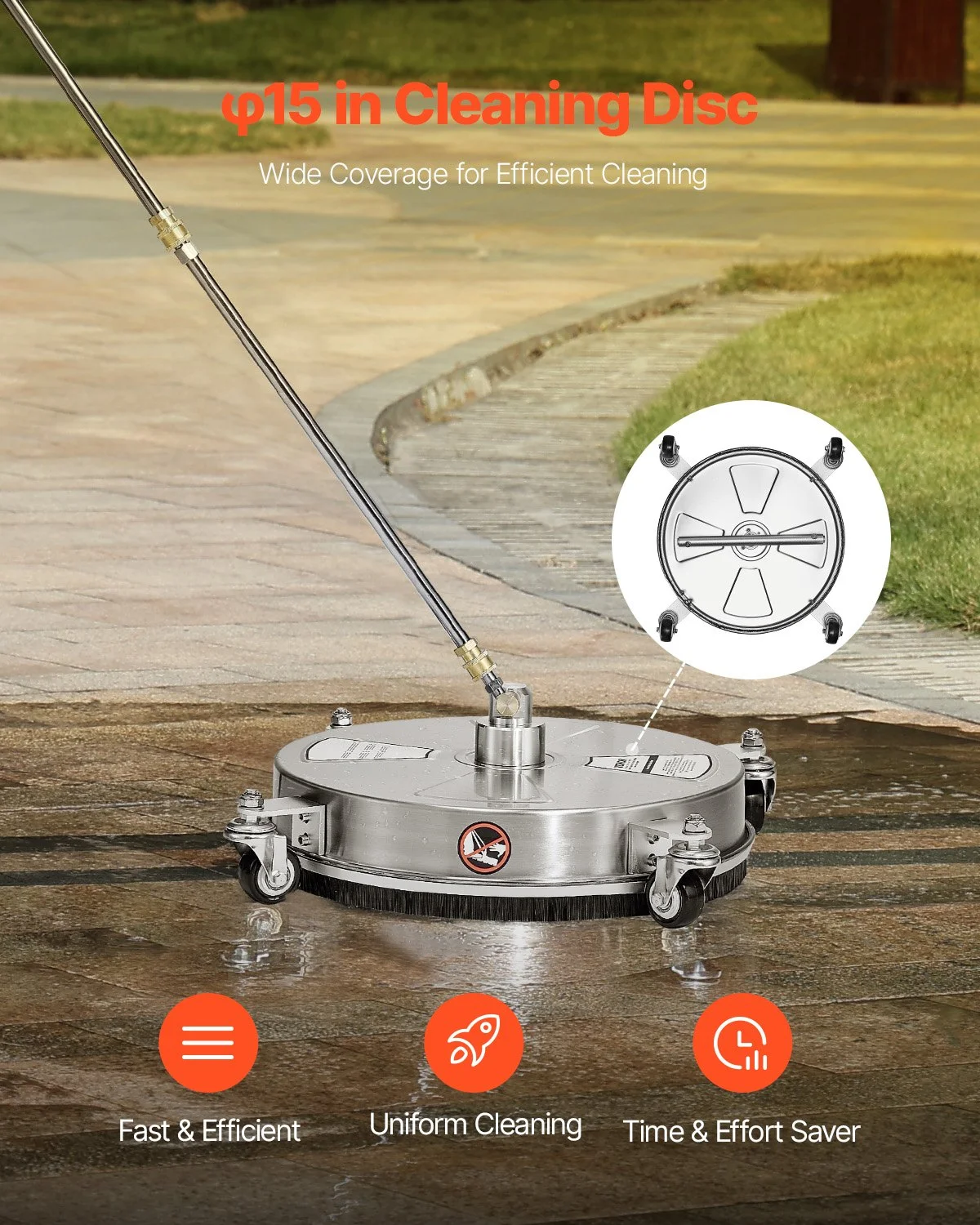 With a high flow rate of 4 gal/min, this ��15-inch pressure washer surface cleaner ensures uniform coverage, leaving no spot behind. Whether it's a big task or regular cleaning, it makes the job easy. Enjoy efficient cleaning while saving time and effort.