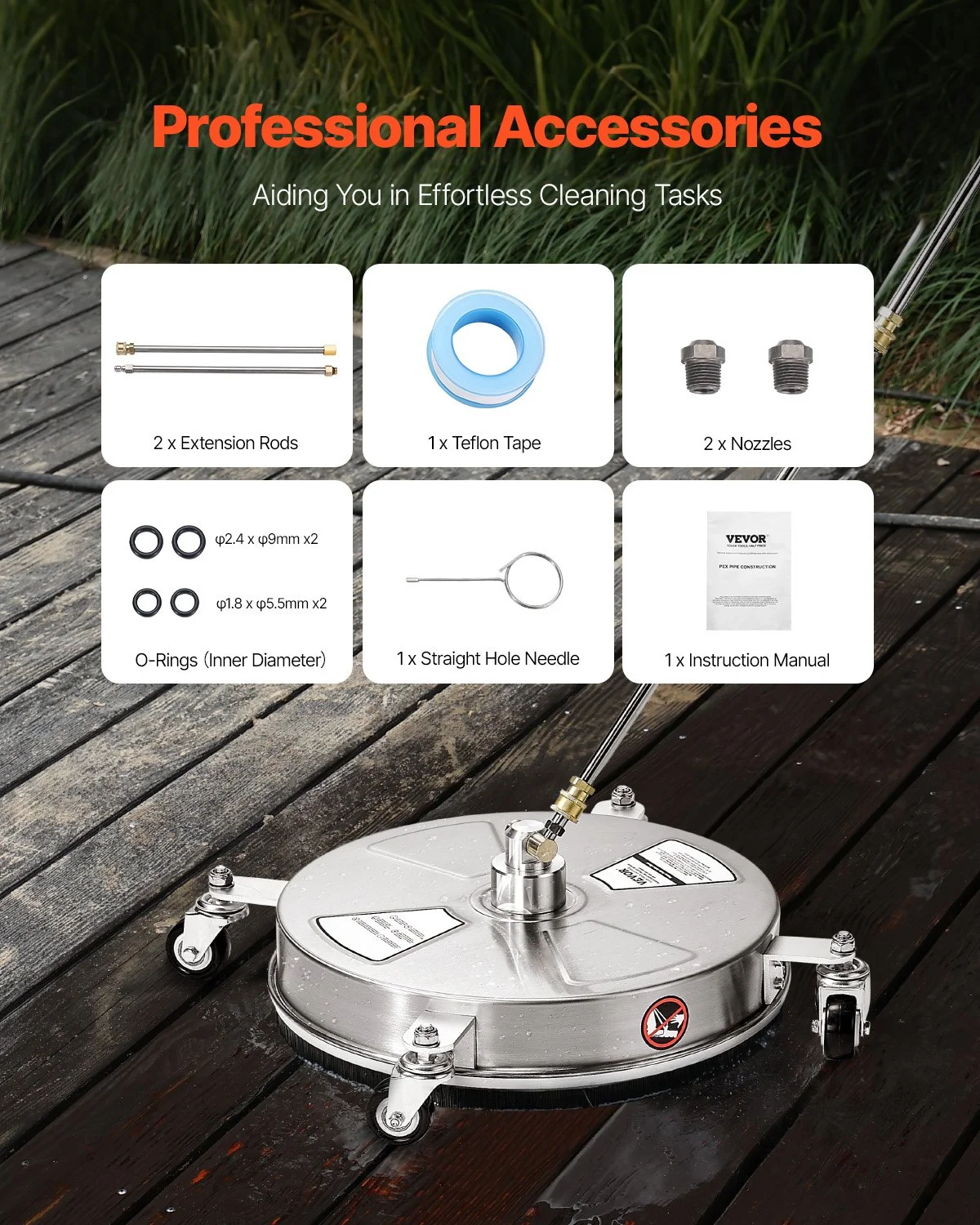 This power washer surface cleaner comes with a variety of professional accessories, including hose connectors and an adapter kit for quicker assembly and immediate cleaning. Plus, a through-hole needle is included to easily solve any clogging issues.