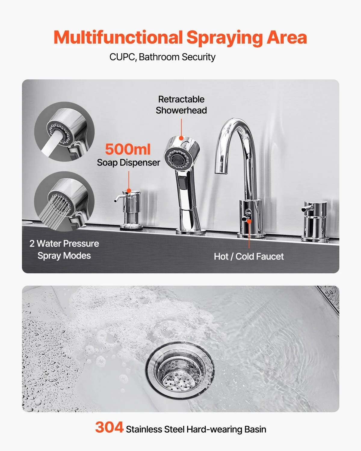 The dog grooming tub is featuring hot and cold faucets, a dual-control showerhead, and a soap dispenser, this design makes pet bathing effortless and efficient. The PE water filter board provides a non-slip draining surface, while the 24 lbs (11 kg) storage cabinet securely stores grooming pet bath stations, keeping everything neat and organized, making pet bathing a breeze