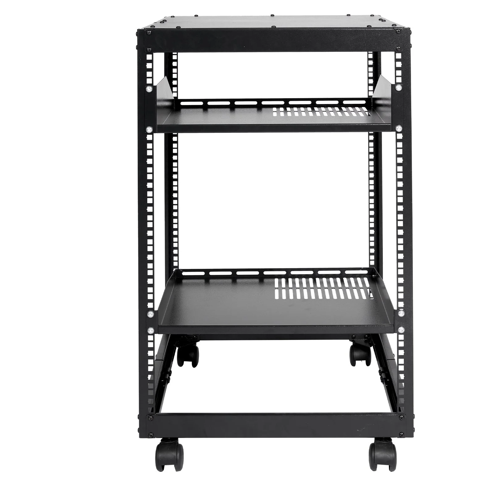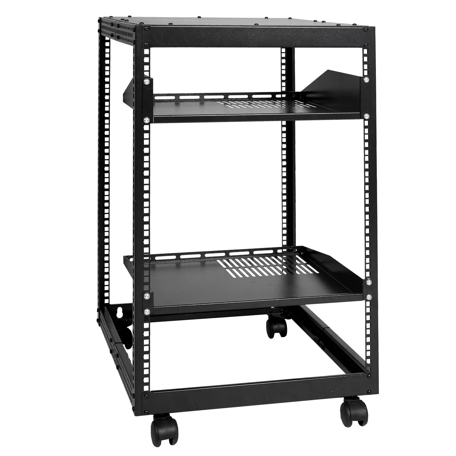 Ergonomic design makes the open frame av rack easier to use. The additional top panel is able to place other items with more available space. Roller design moves anywhere and anytime, is convenient, and is more energy-saving.