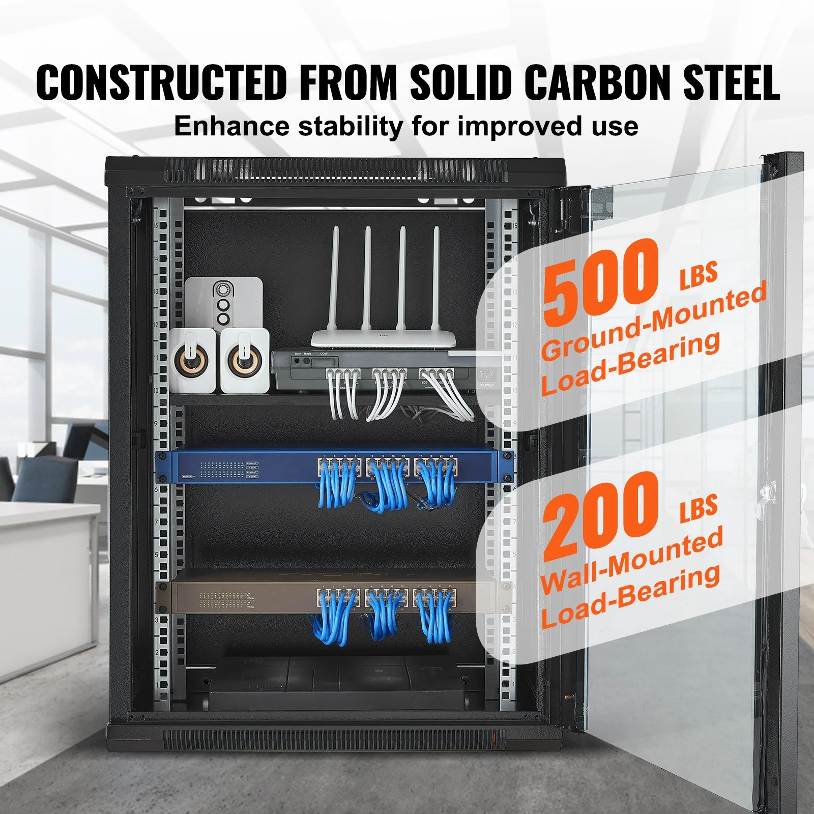 Built with a solid welded frame, our network cabinet is designed for durability and long-lasting performance. With a wall-mount load capacity of 200 lbs and a free-standing load capacity of 500 lbs, it can handle multiple devices with ease.