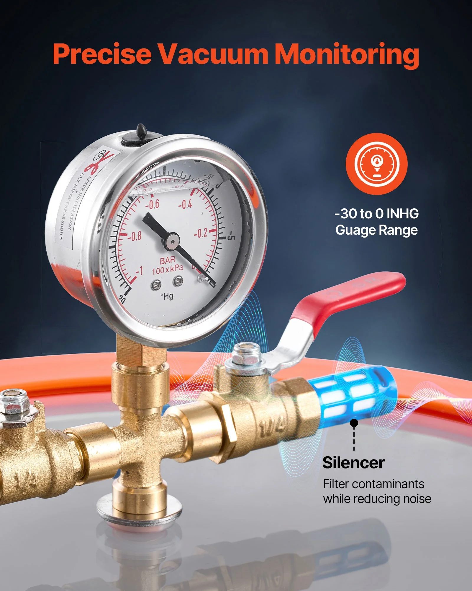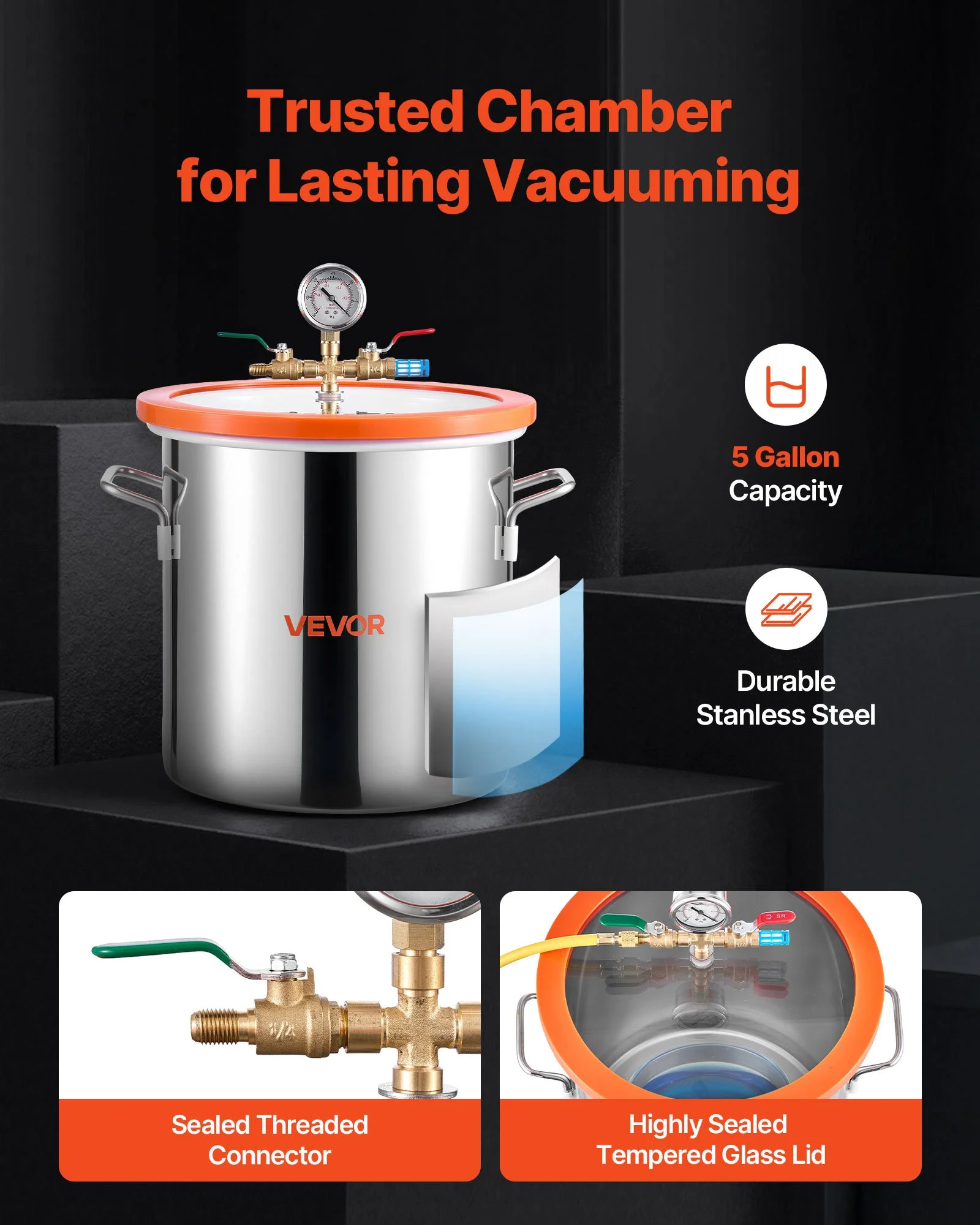 Everything you need is included: a vacuum pump, 5-gallon vacuum chamber, tempered-glass chamber lid, vacuum gauge, 5 ft hose, protective pad, and 0.21qt./200 ml vacuum oil bottle-ready to use right out of the box