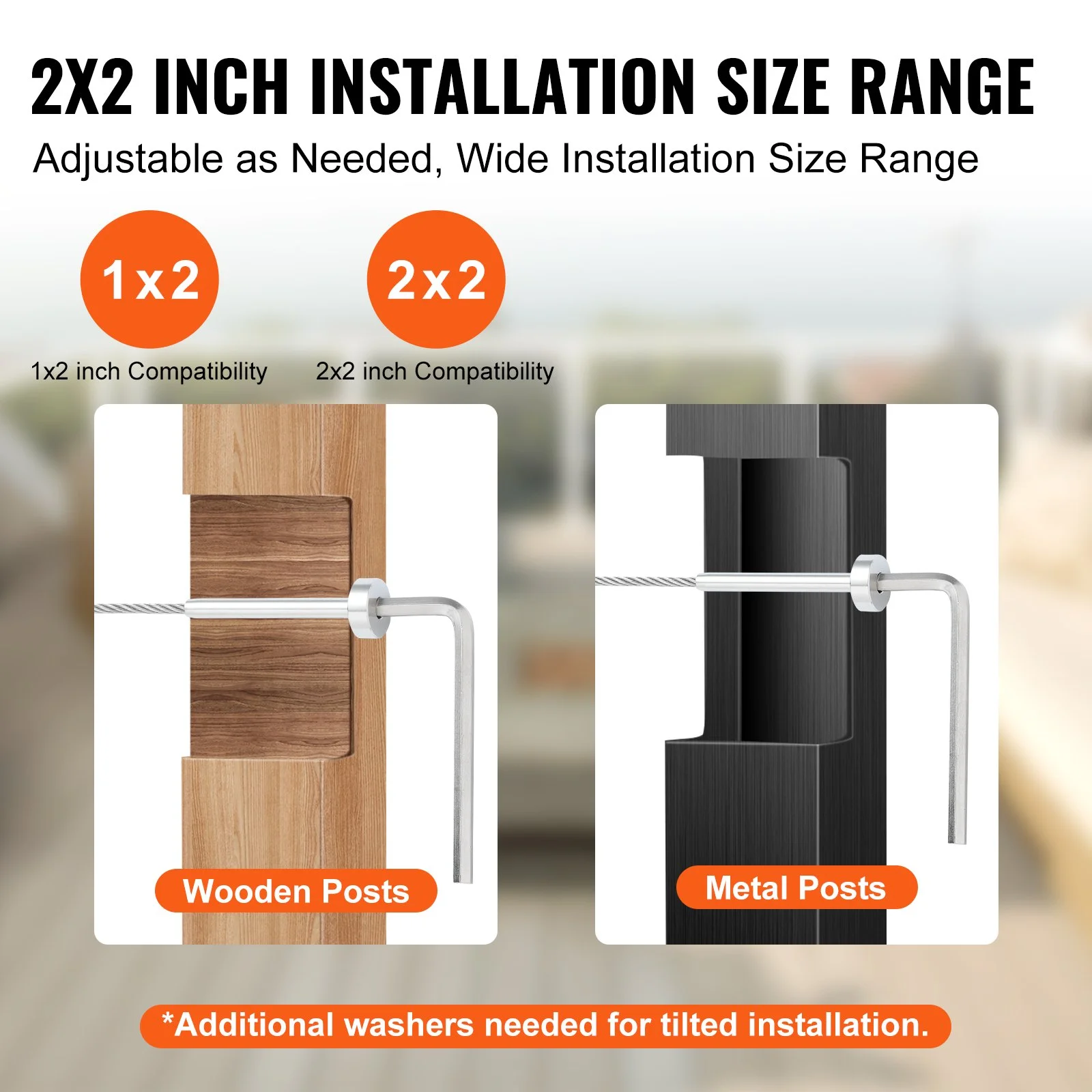 This railing kit is designed for 1/8" steel cable installation and can be used with washers to support angled installations. It is suitable for both 2x2-inch wooden and metal posts, making it convenient for various railing sizes.