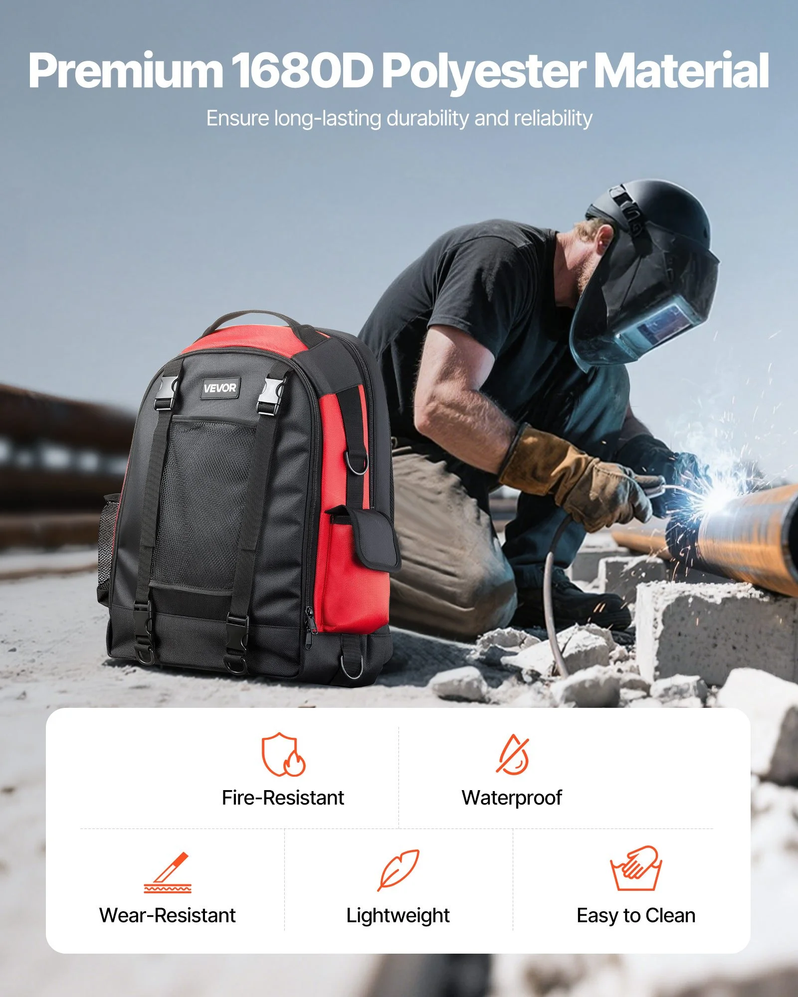 This welder backpack for tools and helmets is crafted from 1680D high-density polyester, offering water resistance, wear resistance, and long-lasting durability. It is lightweight, easy to clean, and also features smooth zipper, ideal for various work environments