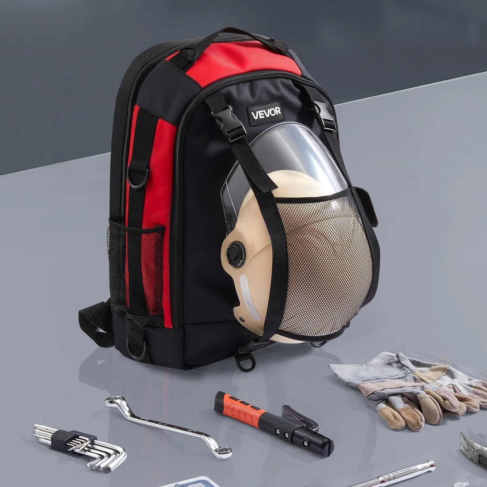 The VEVOR welding backpack offers a spacious 25.2L storage capacity. It features a large storage interior, 2 side pockets, and a helmet bag, easily storing your welding tools, welding helmet, grinder, welding jacket, gloves, and more