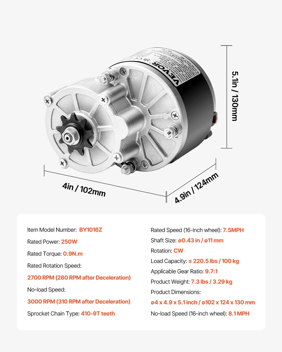 Achieve up to 7.5 MPH at rated speed, and a no-load speed of 8.1 MPH with a 16-inch wheel, ensuring a fast and smooth ride for commuting or recreational use. The rated torque of 0.9N.m ensures reliable performance even on steep inclines and rough terrains.