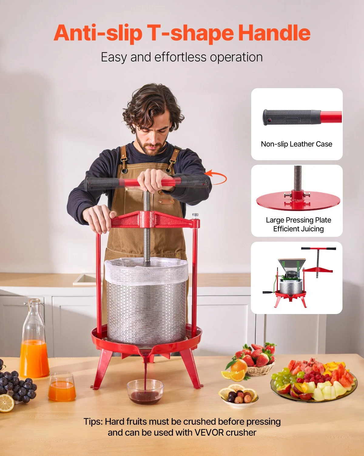 The 14L/3.69-gallon large-capacity design is ideal for family gatherings, parties, wineries, and farms to conveniently produce abundant juice. For the best juicing results, pre-crush fruits using a fruit crusher before pressing