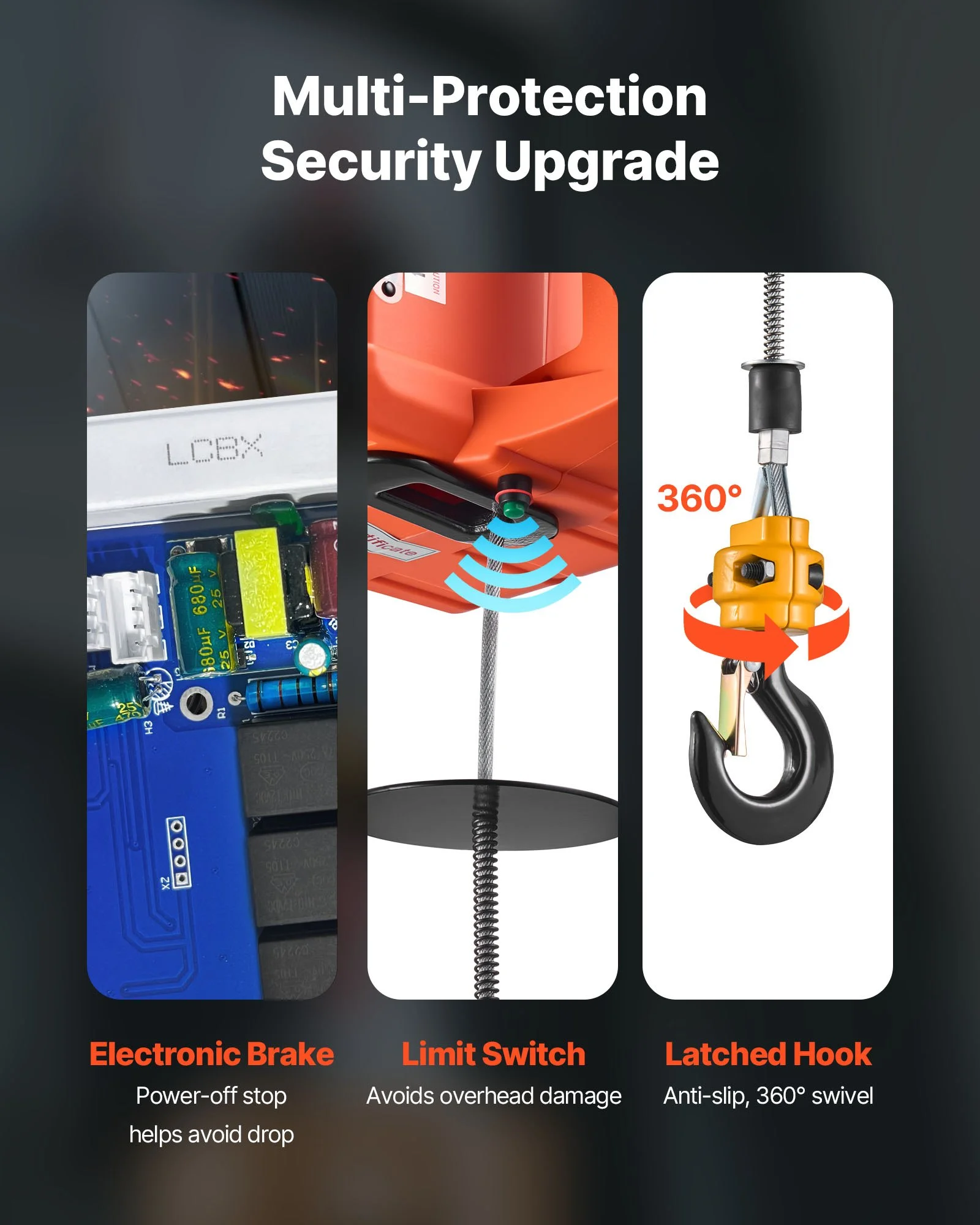 This electric hoist winch combines electronic and mechanical brakes for confident stopping. A limit switch and 360° latch hook add security, and the motor auto-stops at power loss or top limit to help avoid drops